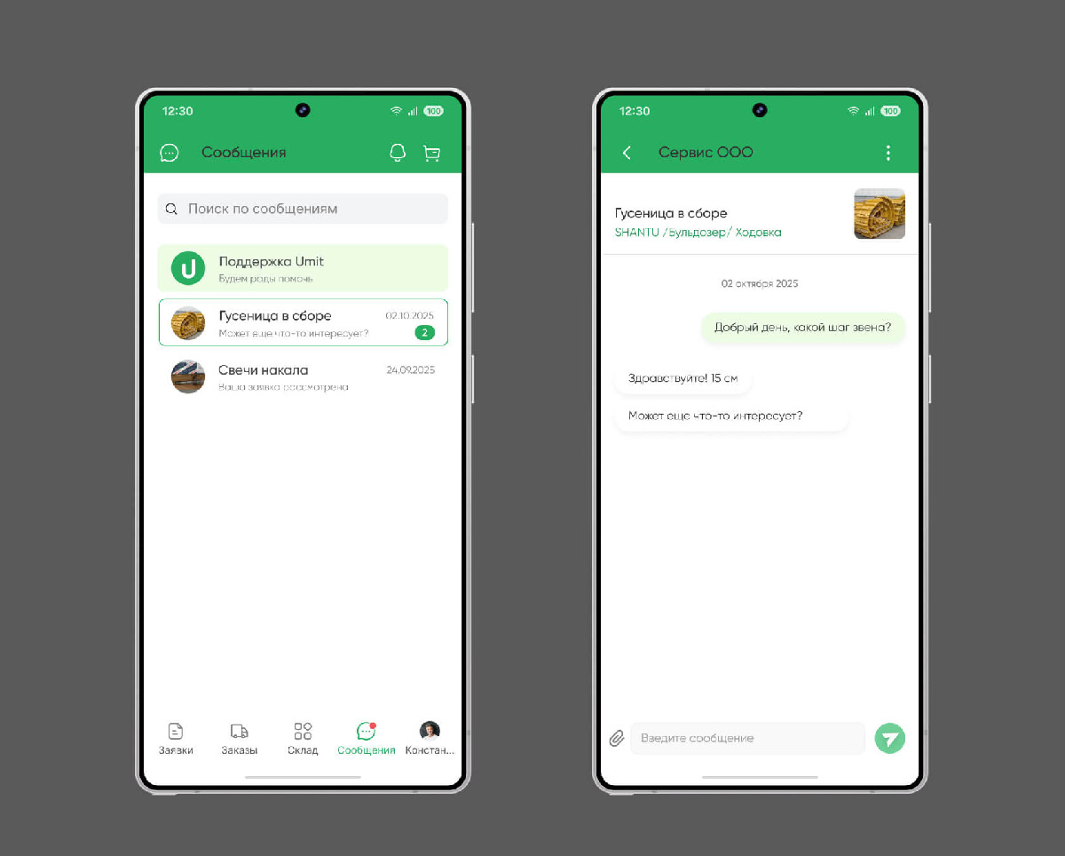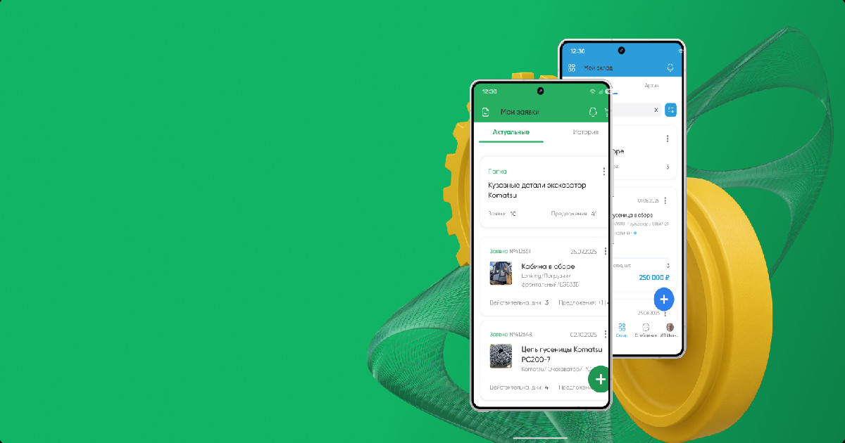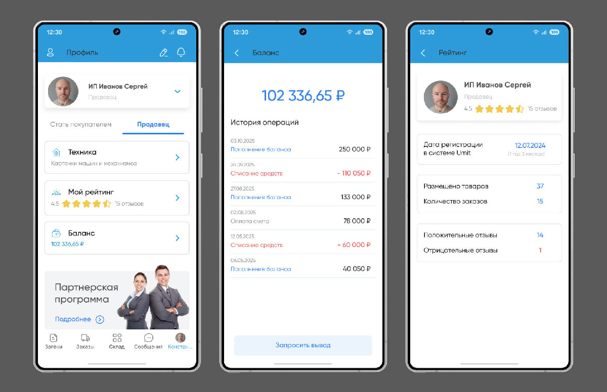 Приложение адаптировано под разные роли пользователей: один аккаунт может включать как профиль покупателя, так и профиль продавца, с возможностью быстрого переключения между ними. Реализованы ключевые разделы для управления товарами, заявками, заказами, корзиной, уведомлениями, чатами и профилем пользователя.