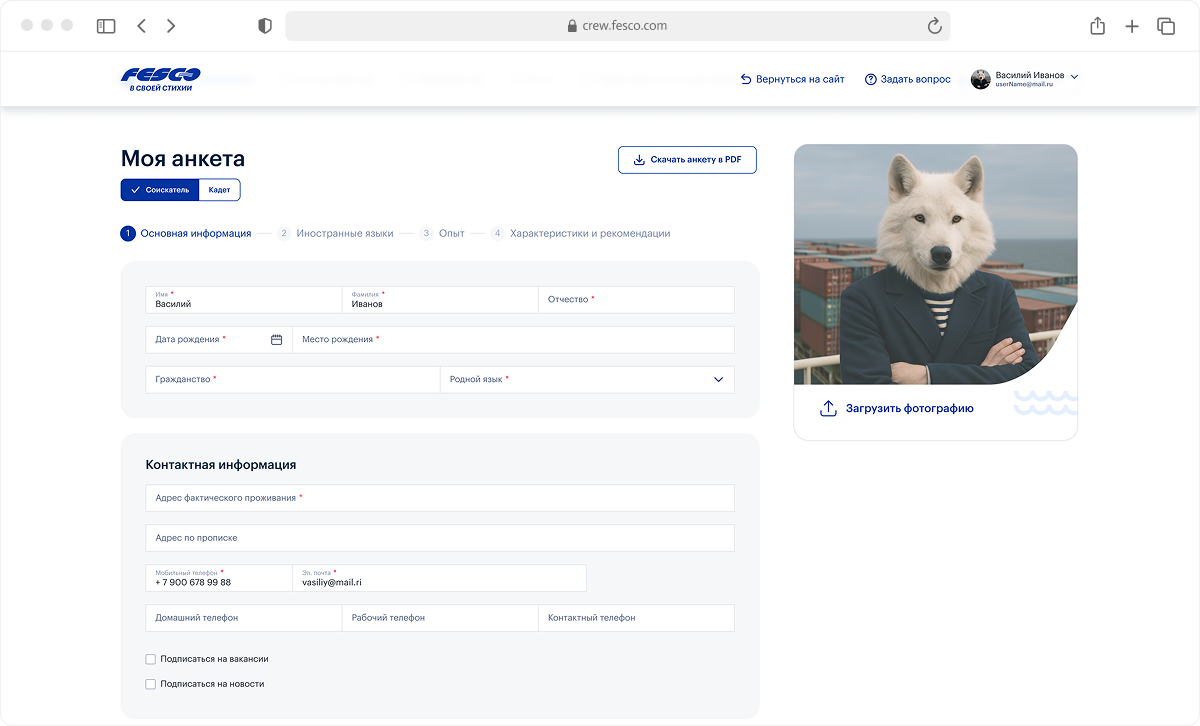 Анкету можно отредактировать, скачать, вернуться позже и подать снова, если пришел отказ. Система не ставит точку, а становится персональным пространством моряка для общения с FESCO.