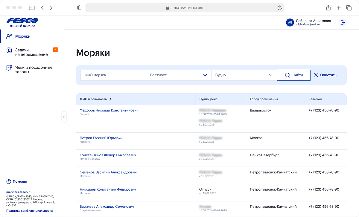 В АРМ специалист видит каждого моряка: контакты, историю рейсов, статусы, документы с датами истечения, служебные отзывы из 1С. Информация собрана в гибкую таблицу с сортировкой и фильтрацией. На детальной странице моряка добавлено разделение по типам информации, чтобы не перегружать интерфейс: рейсы, задачи на обучение, проверка документов, документы, служебные отзывы. Если FESCO предлагает моряку новый рейс, менеджер получает уведомление о его решении.