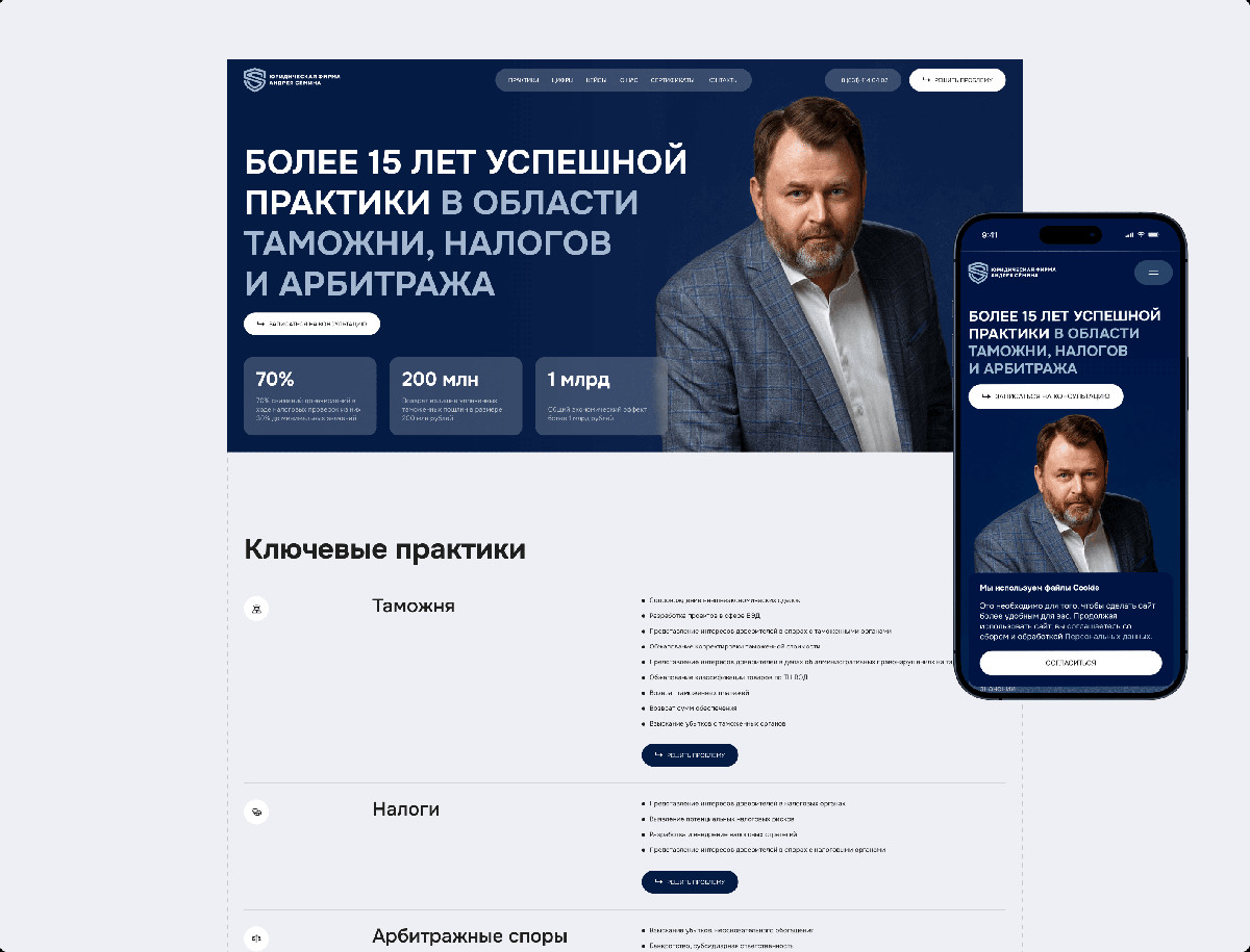 Разработать лендинг-страницу для юридической фирмы Андрея Семина, специализирующейся на таможенном праве, налоговом праве и арбитраже. Сайт должен был представить услуги фирмы, её преимущества и обеспечить удобство взаимодействия для потенциальных клиентов.