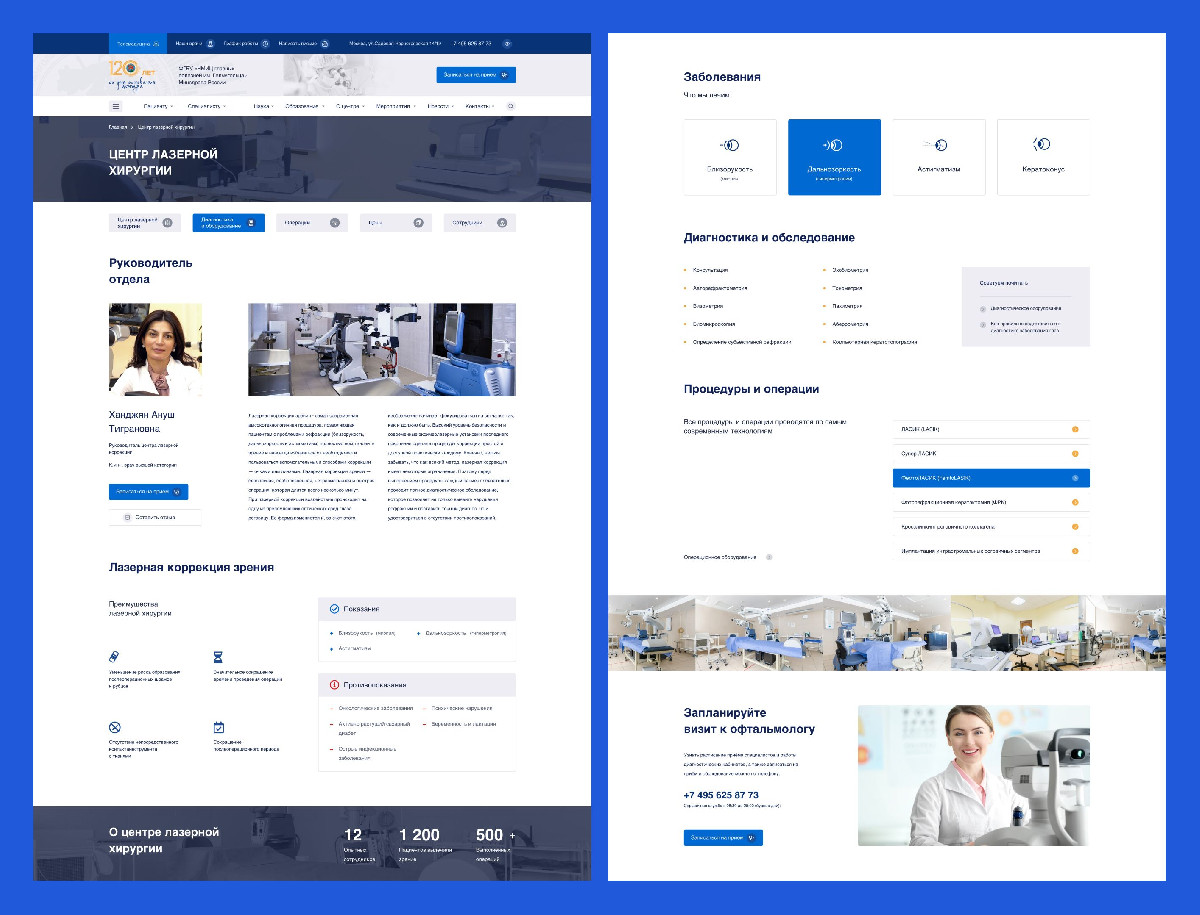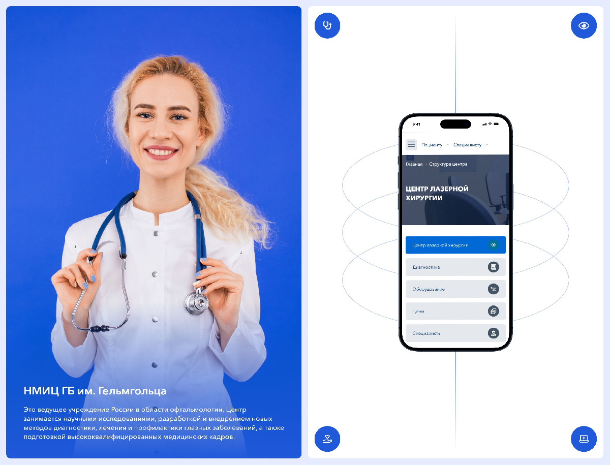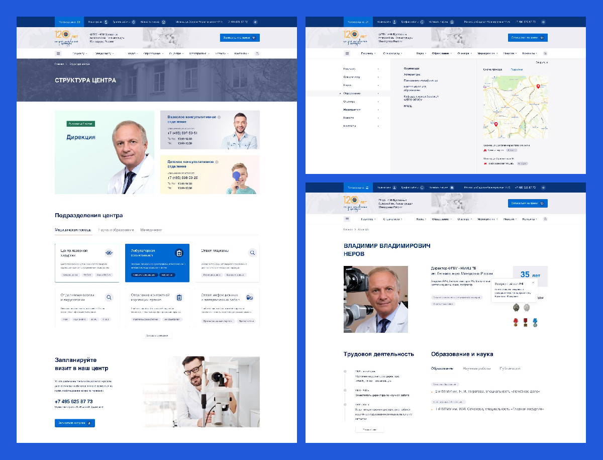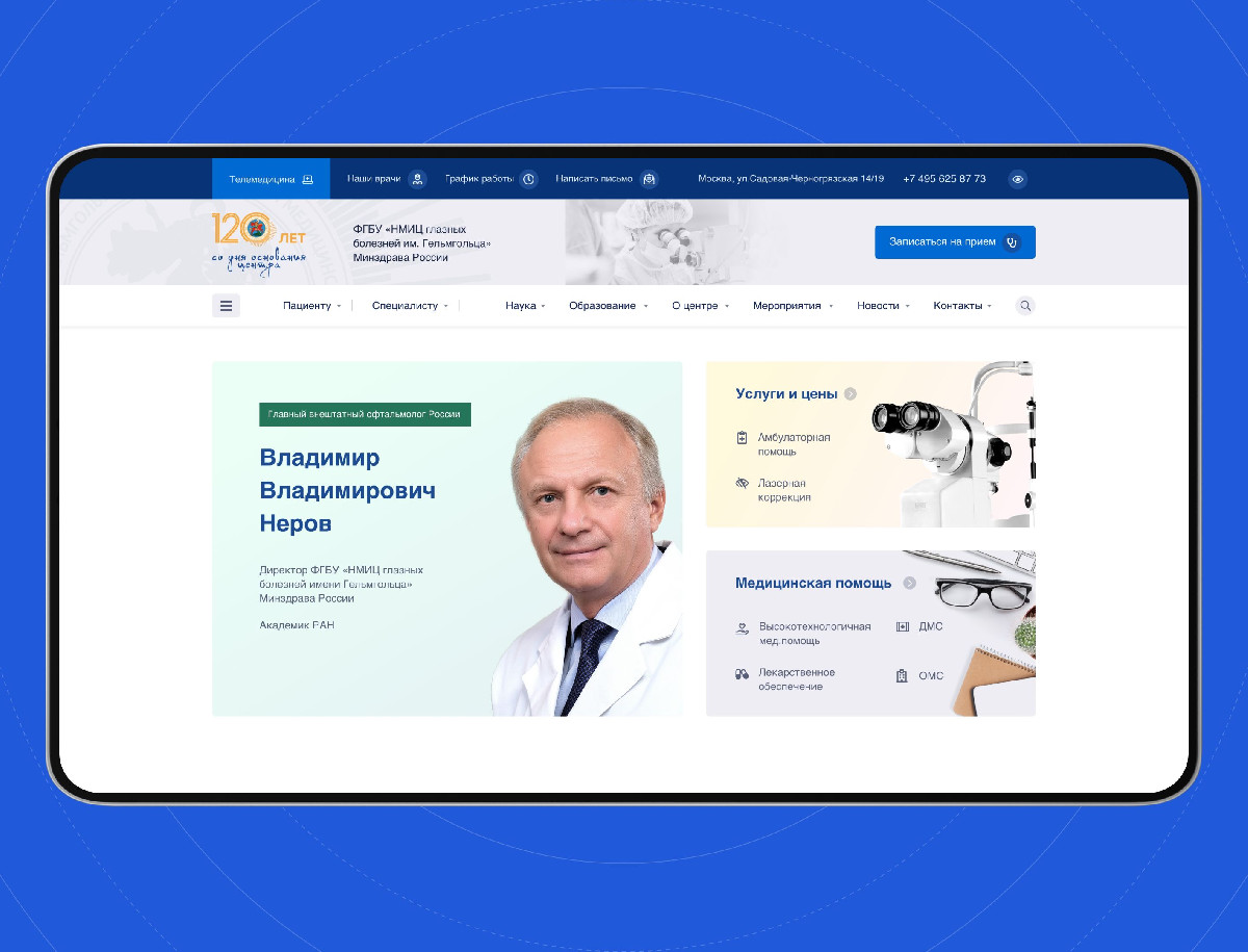 Разработать официальный сайт для Национального медицинского исследовательского центра (НМИЦ) глазных болезней имени Гельмольца. Сайт должен был предоставлять пациентам, врачам и партнёрам актуальную информацию о деятельности центра, его услугах, научных достижениях и образовательных программах, а также обеспечивать удобство взаимодействия.