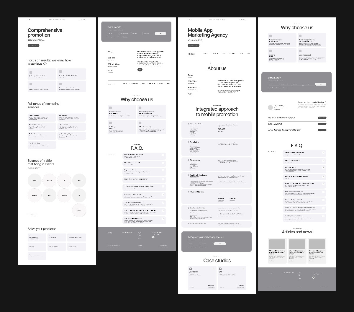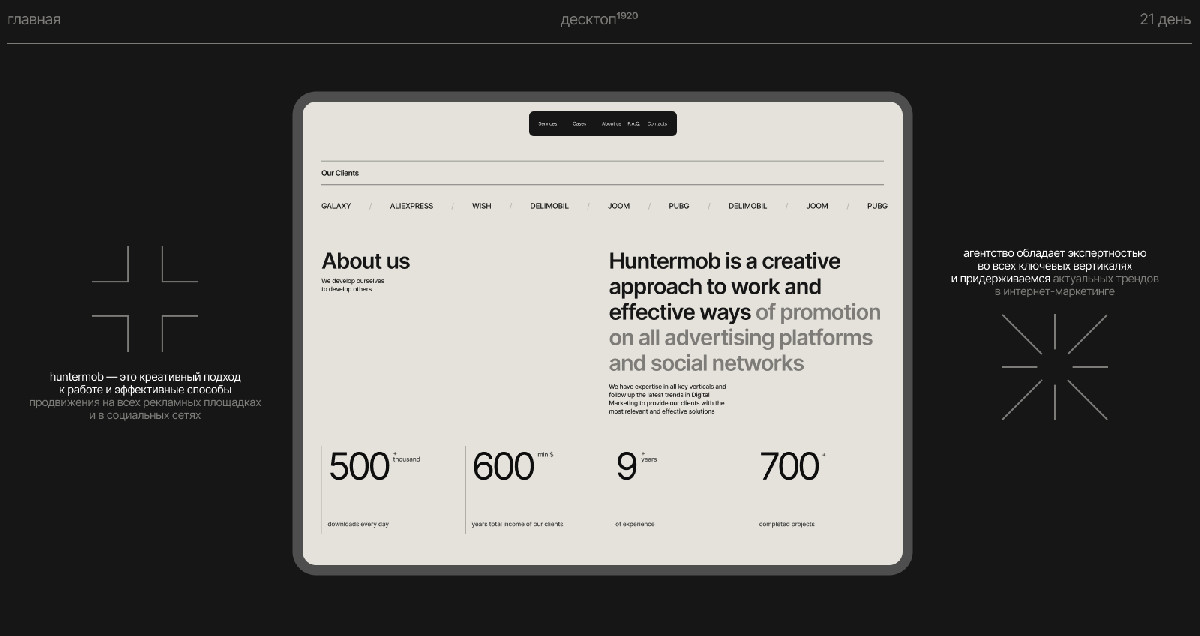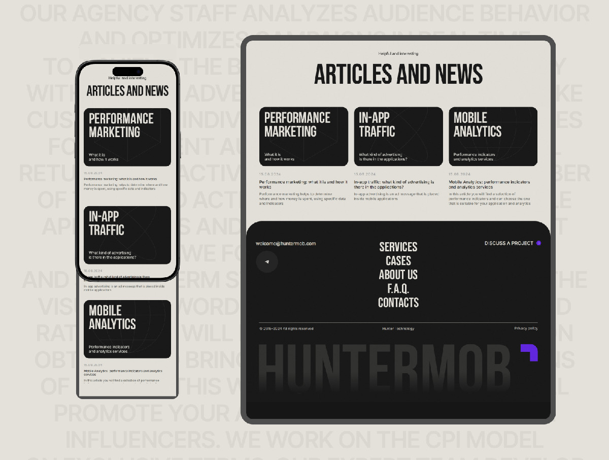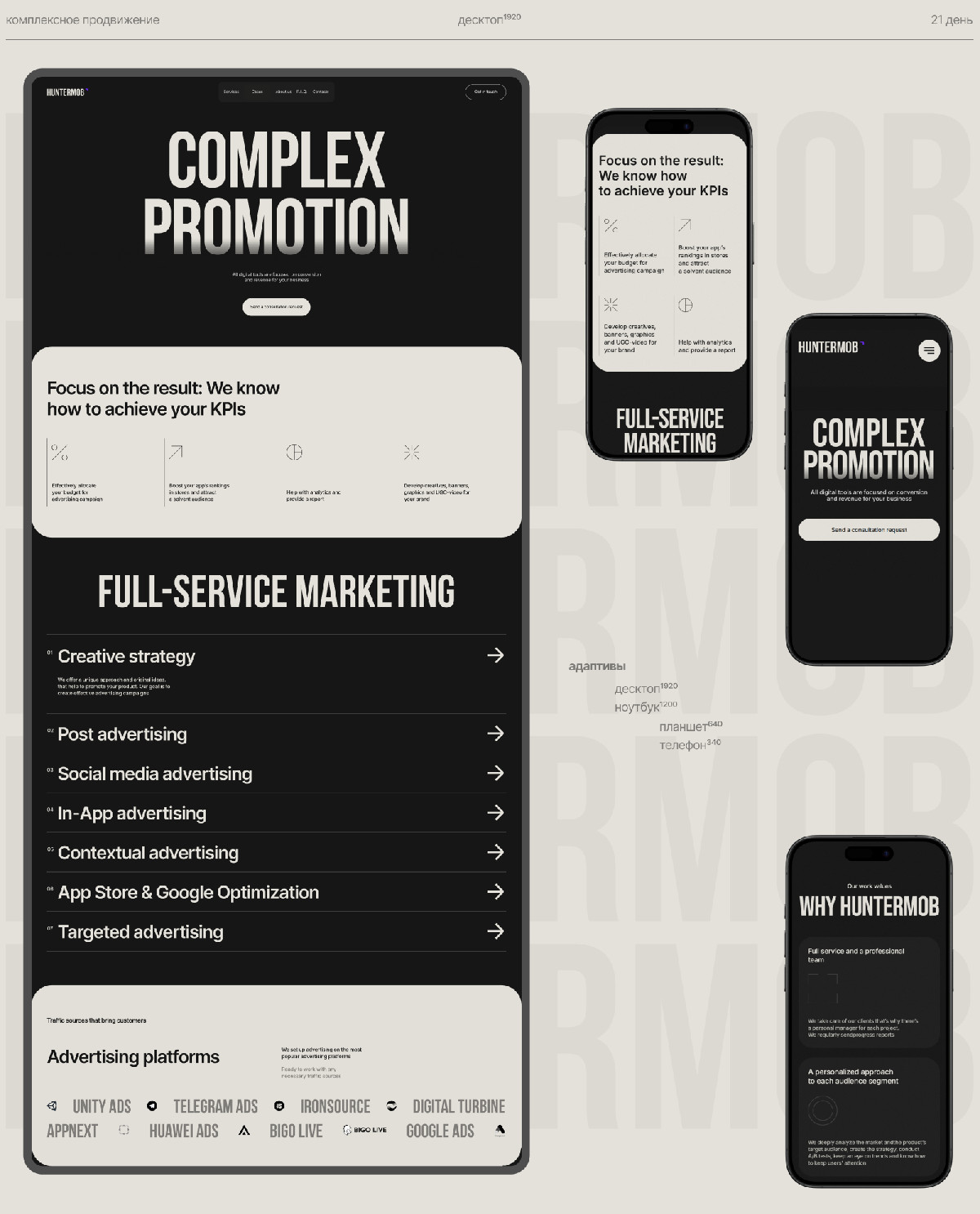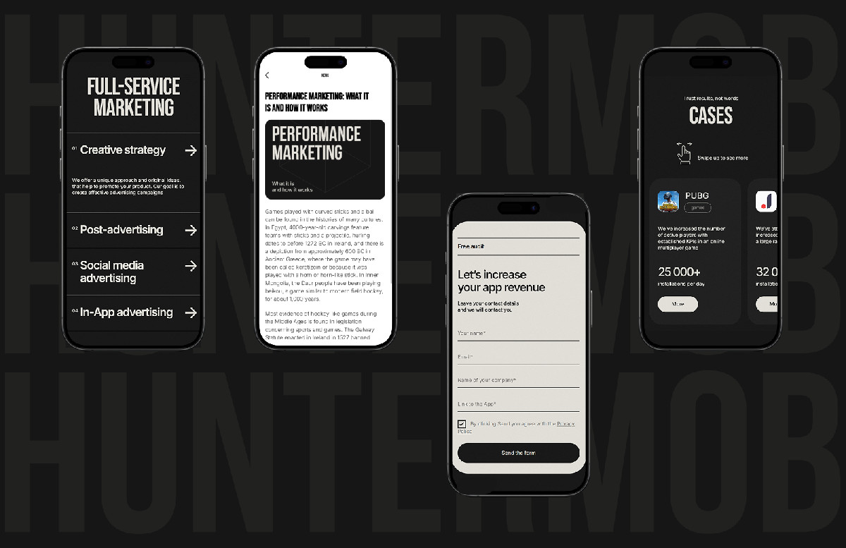Всё закрутилось в 2024 году, когда к нам пришла Дарья с запросом создать сайт для HunterMob. Это настоящие охотники за пользователями — агентство мобильного performance-маркетинга, с упором на привлечение новых пользователей для мобильных приложений.