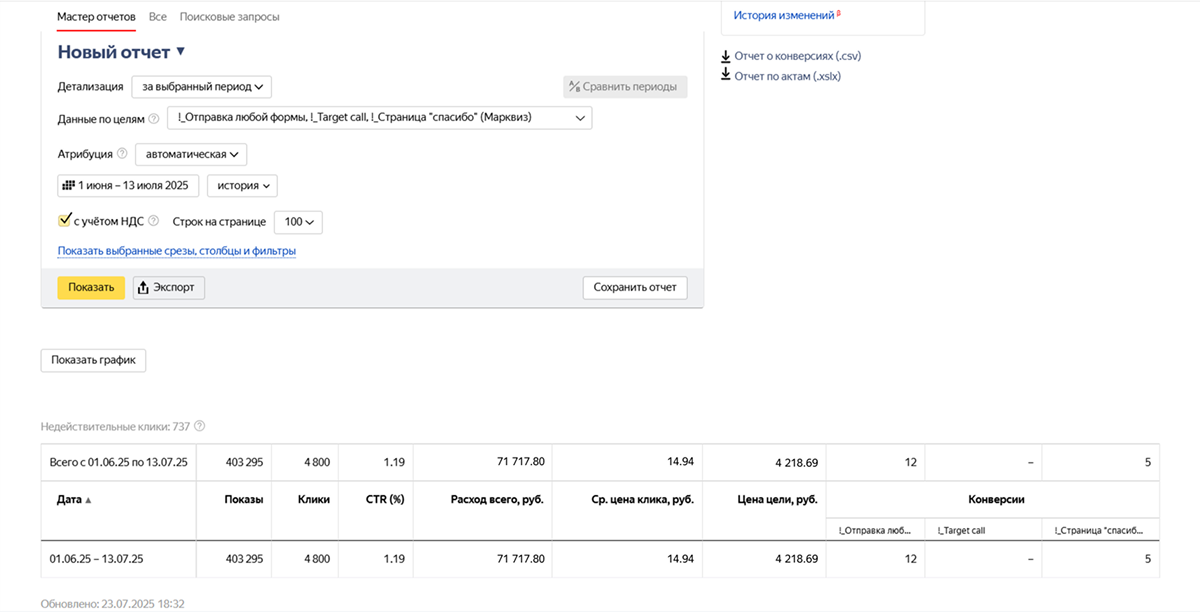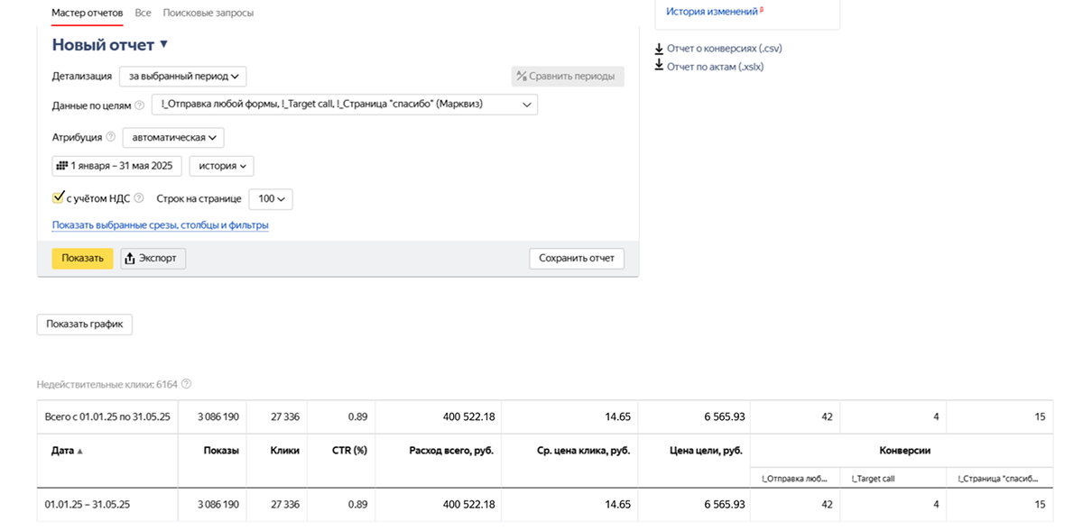 Мы настроили общую конверсионную цель на отправку заявок — для точного учёта лидов.