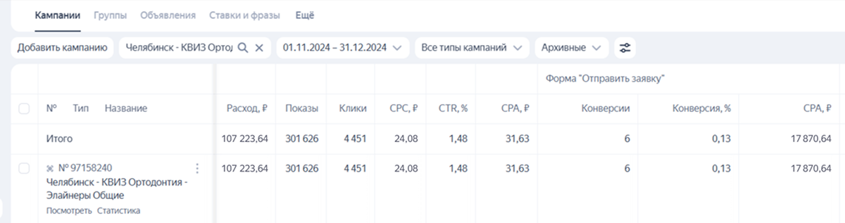 Однако, несмотря на значительные вложения в Яндекс.Директ, бизнес столкнулся с критически низкой эффективностью: