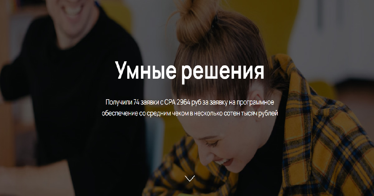 Умные решения: получили 74 заявки с CPA 2964 руб за заявку на программное обеспечение со средним чеком в несколько сотен тысяч рублей