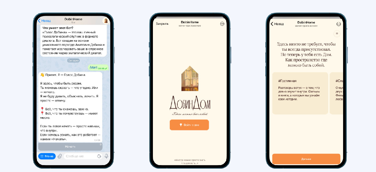 Разработано Mini App для проекта «Голос Добина» — интерактивного психологического сервиса, проводящего персонализированные эмоциональные сессии с помощью ChatGPT. Пользователь проходит фазовый путь из 3 или 7 этапов: отвечает на вопросы, получает интерпретацию и терапевтическую историю. В приложении