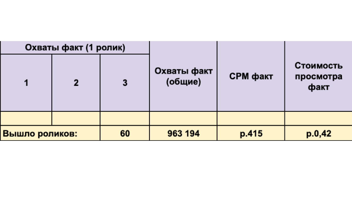 реализовали сотрудничество с 20 авторами;нашли и запустили в работу порядка 27 вирусных референсов;сняли и опубликовали 60 роликов;охватили 963 тыс. человек;получили просмотр по 42 копейки;CPM = 415 руб.