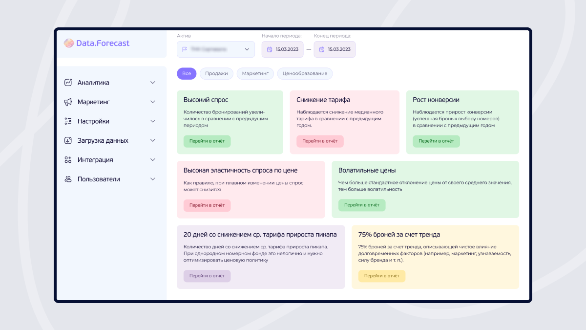 Логика работы моделей позволяет формировать прогноз по различным комбинациям отелей и категорий номеров. Такое прогнозирование помогает эффективно управлять доходами объекта размещения и оперативно реагировать на критические отклонения. Для того, чтобы пользователям было легче ориентироваться, успешно реализовали интеллектуальные визуальные подсказки.