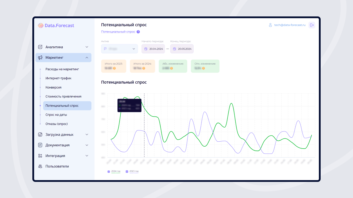 Data.Forecast содержит в себе комплекс ежедневно обучаемых моделей, автоматически объединяет и обрабатывает данные из внешних маркетинговых источников: