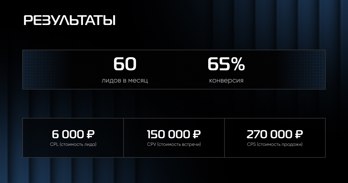 - 10% лидов сконвертировались во встречи, стоимость встречи сократилась до 150 000 руб.;
