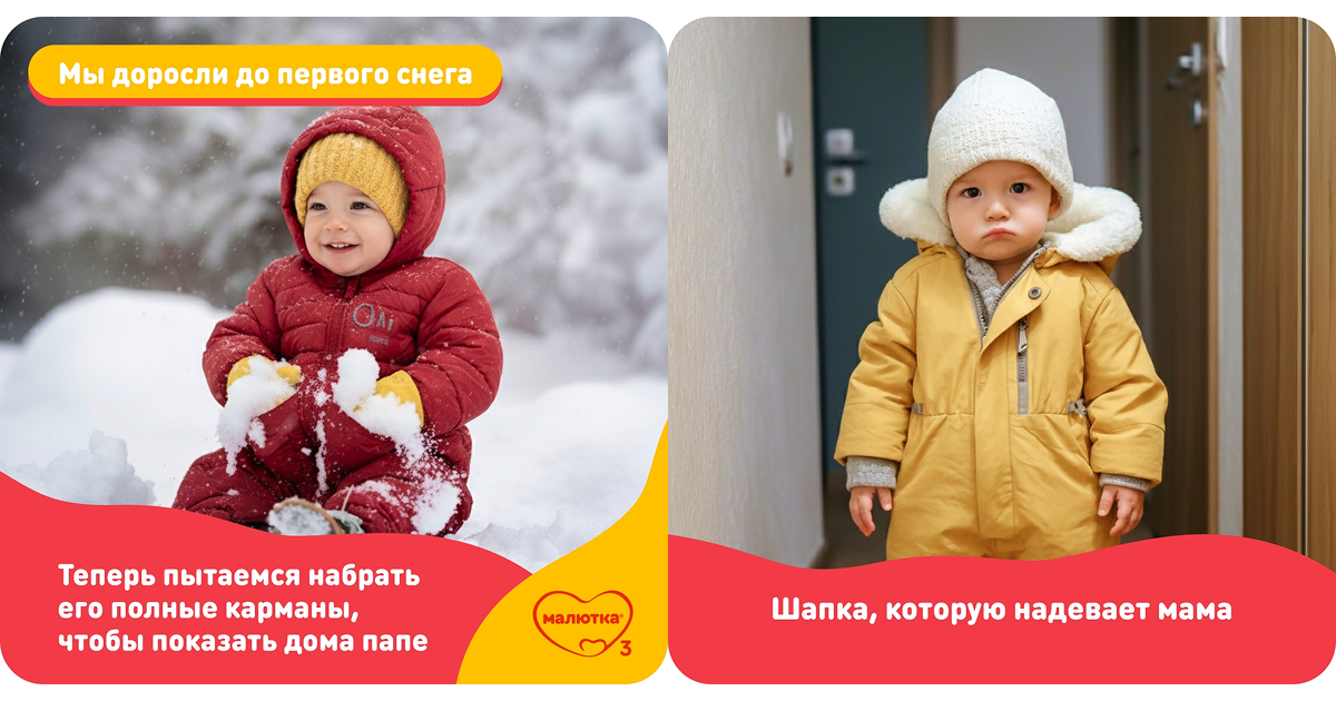 На основе изученных инсайтов мы выстроили контент-стратегию вокруг легких, жизненных и эмоционально близких ситуаций, с которыми сталкиваются родители малышей. Визуальные материалы созданы с помощью ИИ и доработаны нашей командой дизайнеров.