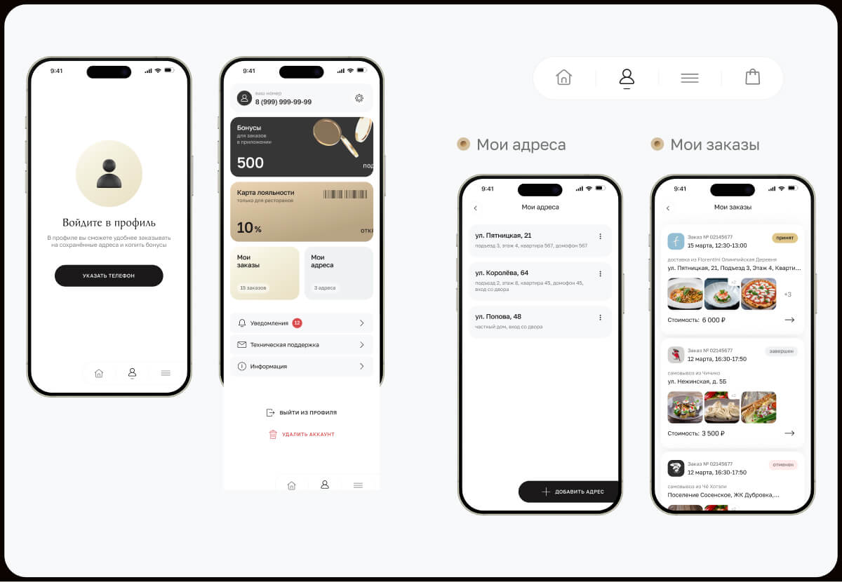 Команда решила отказаться от шаблонов и создать собственное приложение, которое объединит все рестораны и станет основным каналом коммуникации с гостями. Наша задача — спроектировать и сделать дизайн приложения с нуля: удобного, современного, масштабируемого и понятного пользователям, объединив в нём доставку, программу лояльности, отзывы, личный кабинет, новости и бронирование столиков. При этом важно сохранить индивидуальность каждого ресторана, визуально собрав их в единую экосистему.