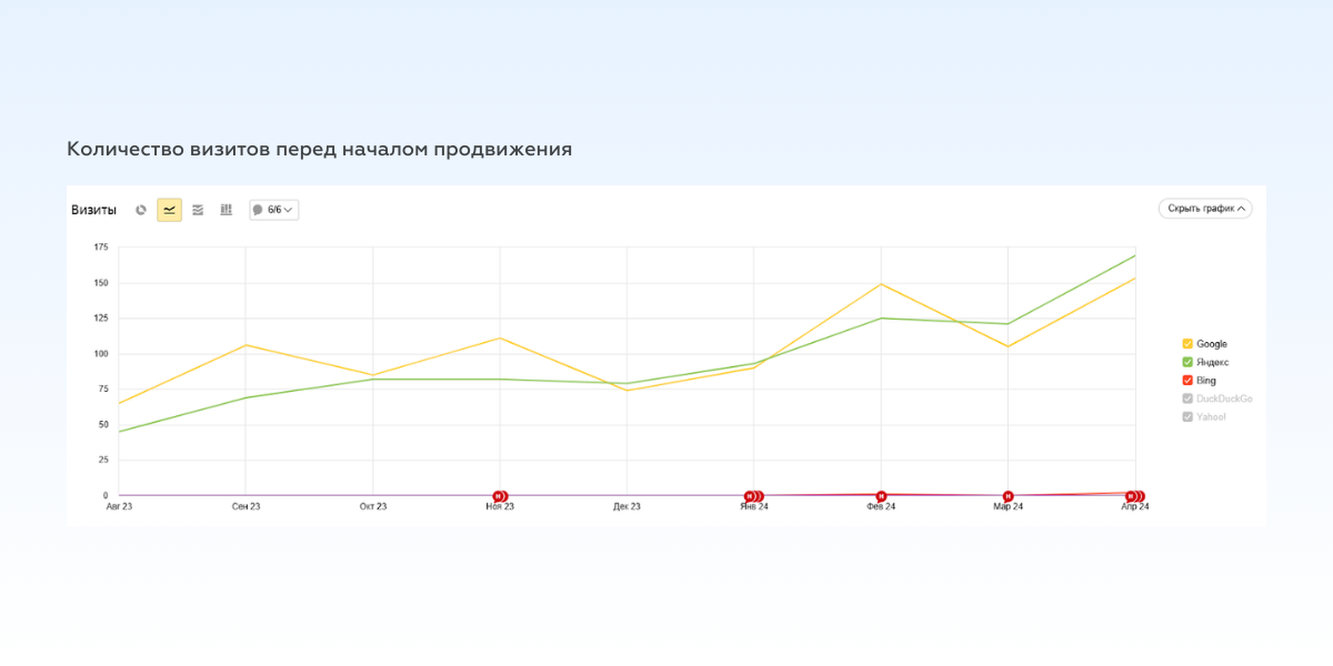 От продвижения клиент хотел получить рост числа заявок и лидов через поисковую выдачу. Он отметил, что сайт существует более года, посещений практически не приносит, а почти весь трафик поступал из контекстной рекламы.