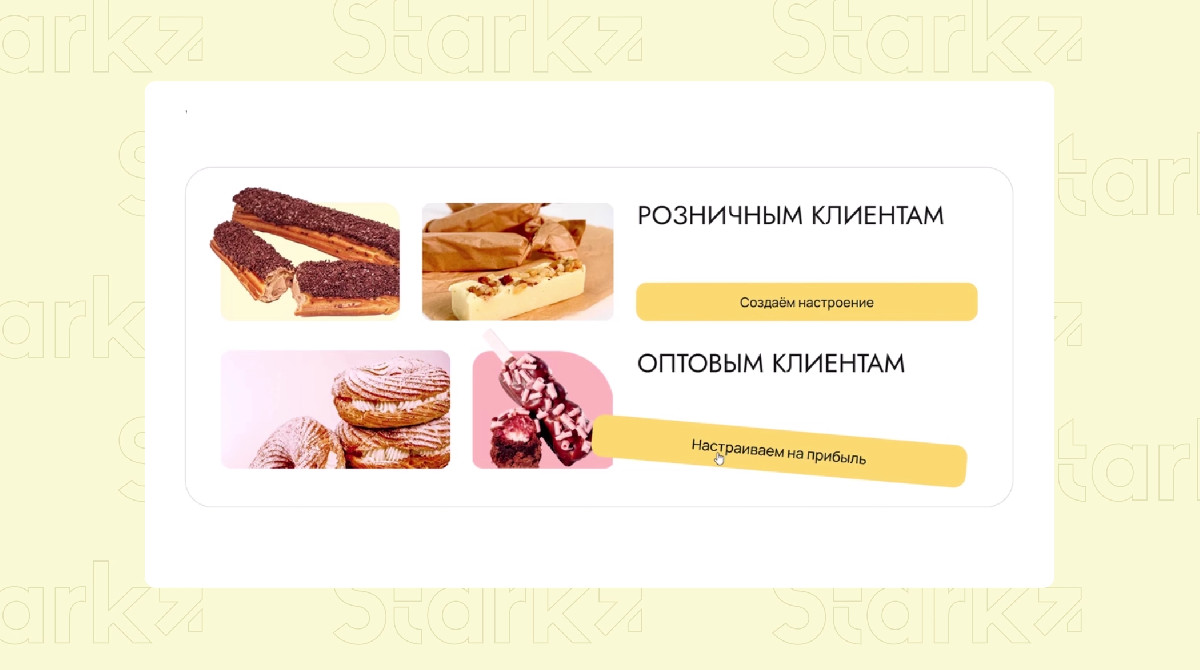 Для розницы сделали открытый каталог с ценами и корзиной, а для опта — лендинг с квизом и доступом в ЛК.Страница для B2B-сегмента встречает клиента заголовком «Десерты оптом из нашего кондитерского цеха. Наш цех=ваш цех», четко указывая на коммерческое предложение и отсекая случайных розничных покупателей. Формулировка «наш цех=ваш цех» делает акцент на собственном производстве, показывая, что клиент работает непосредственно с производителем, а не перекупщиком. Также подобная фраза создает доверие и снижает барьер для первой покупки, так как клиент начинает воспринимать поставщика как часть своего бизнеса. Сразу за заголовком следует лид-форма «Запросить прайс с оптовыми ценами» с классическим сбором данных (имя, телефон, почта).