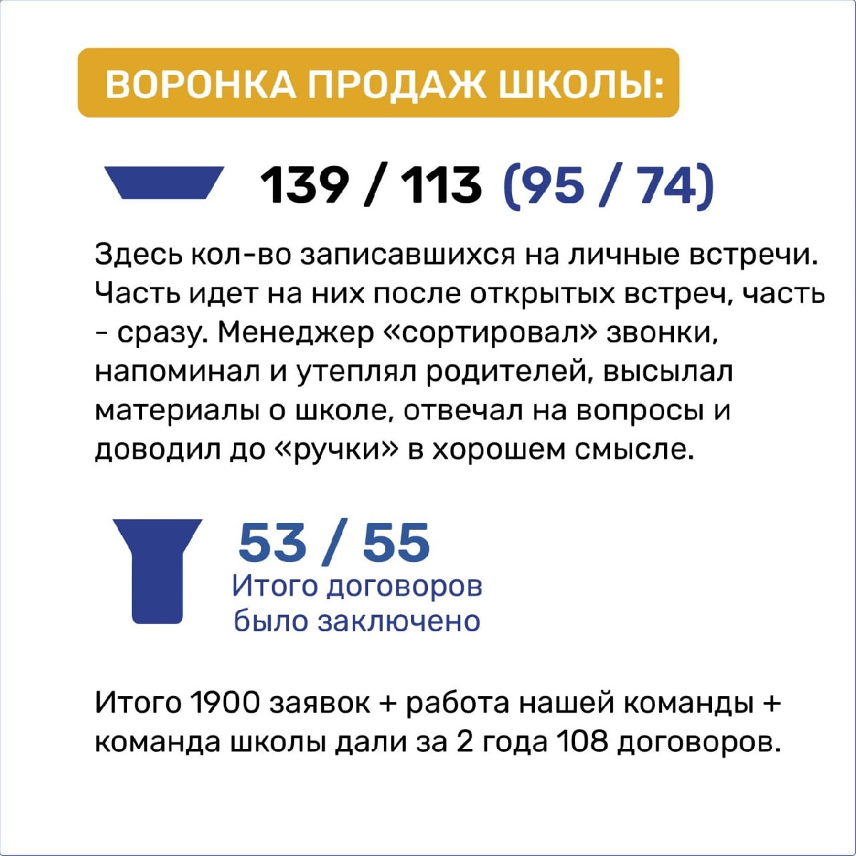 Комплексный подход (9 каналов, CRM, отдел продаж) превратил слабый трафик в 108 договоров для семейной школы.