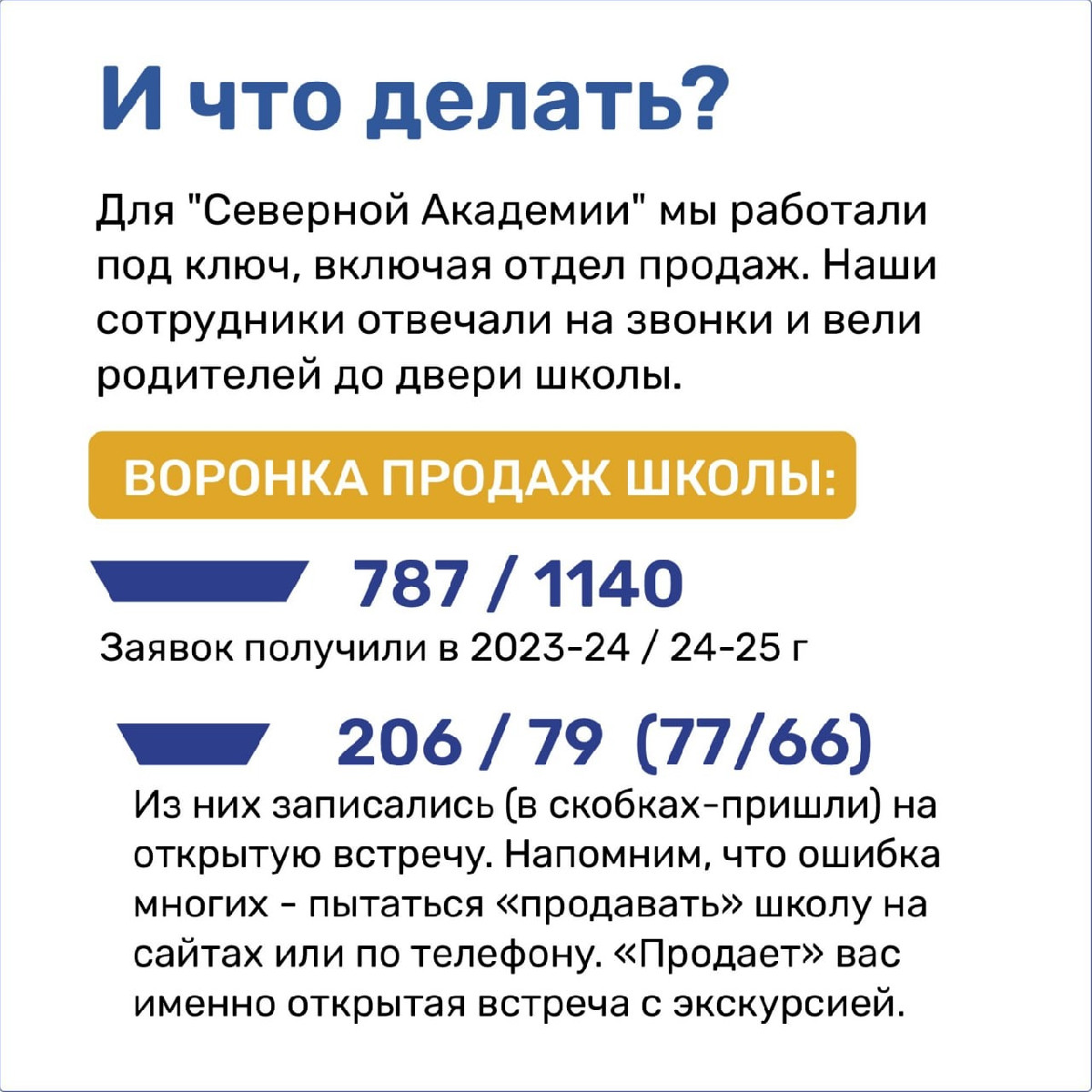 Семейная школа «Семейная Академия» в Архангельске открыла двери, но столкнулась с низким набором: слабая конверсия воронки (6,7% в 2024), мало заявок на экскурсии и договоры. Клиент потратил 290 000 ₽ на рекламу за год, но не закрывал классы от 1 до 11.