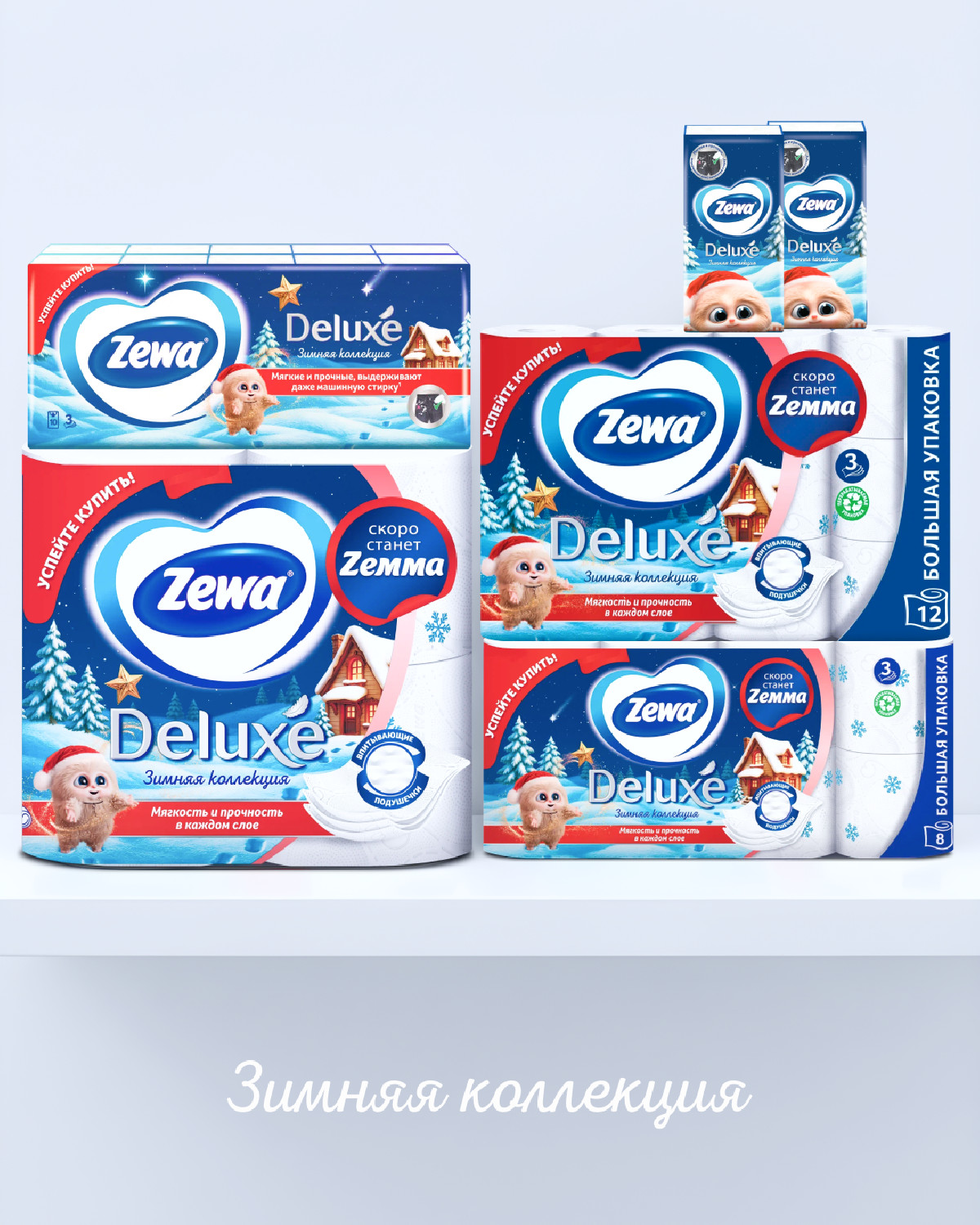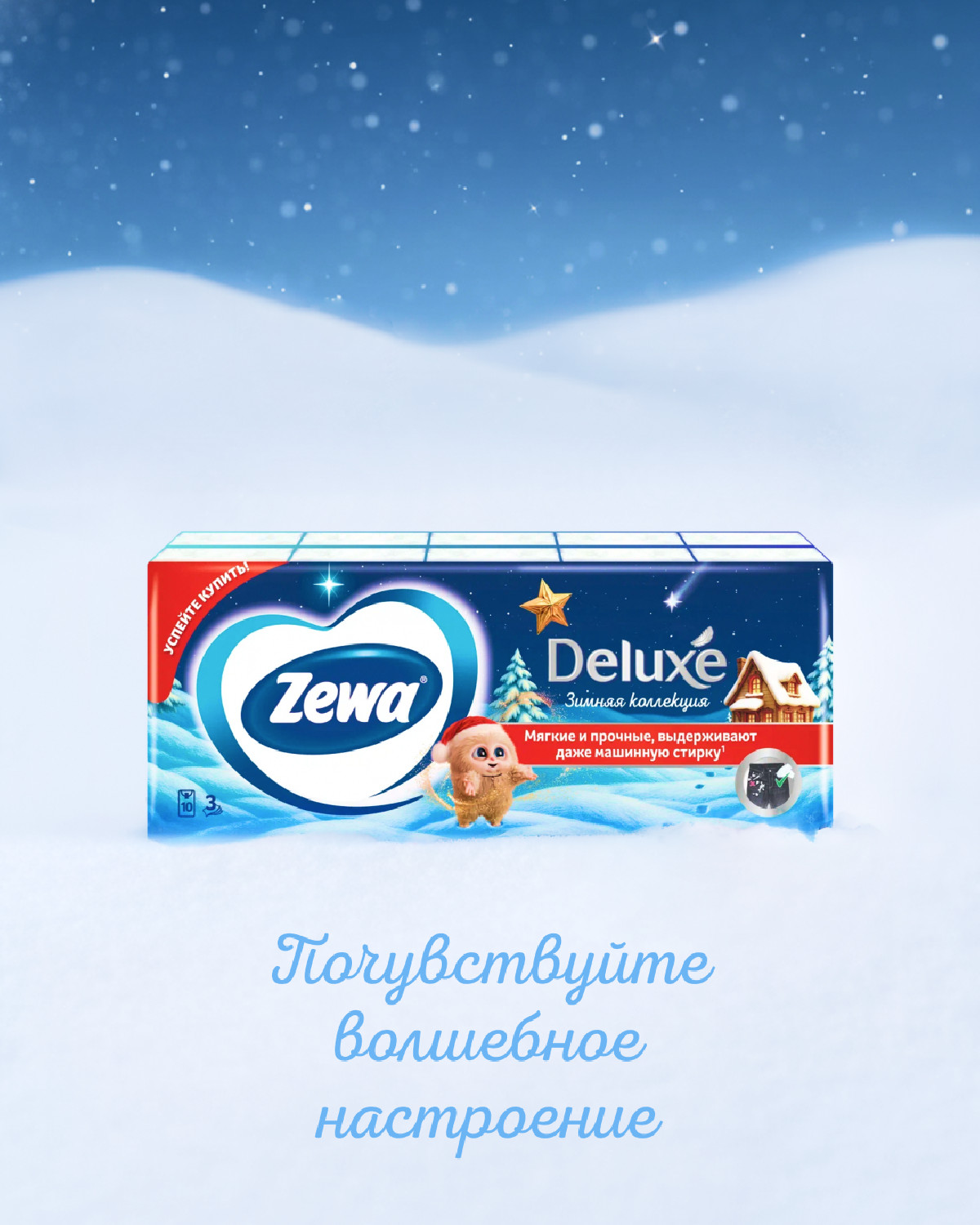 Проект стал примером аккуратной эволюции сезонного дизайна. Мы усилили зимнюю атмосферу Zewa и расширили визуальную историю бренда, не ломая привычный образ, а делая его более живым и человечным.