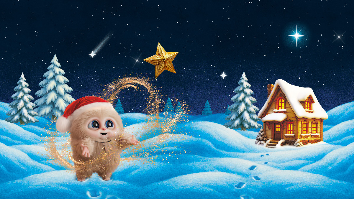 Мы построили сюжет волшебного путешествия: домовёнок выходит из дома в снежную страну. Вся линейка собрана вокруг единой сцены — свет в окнах, снег, ожидание каникул. Упаковка и визуалы работают как цельная история.