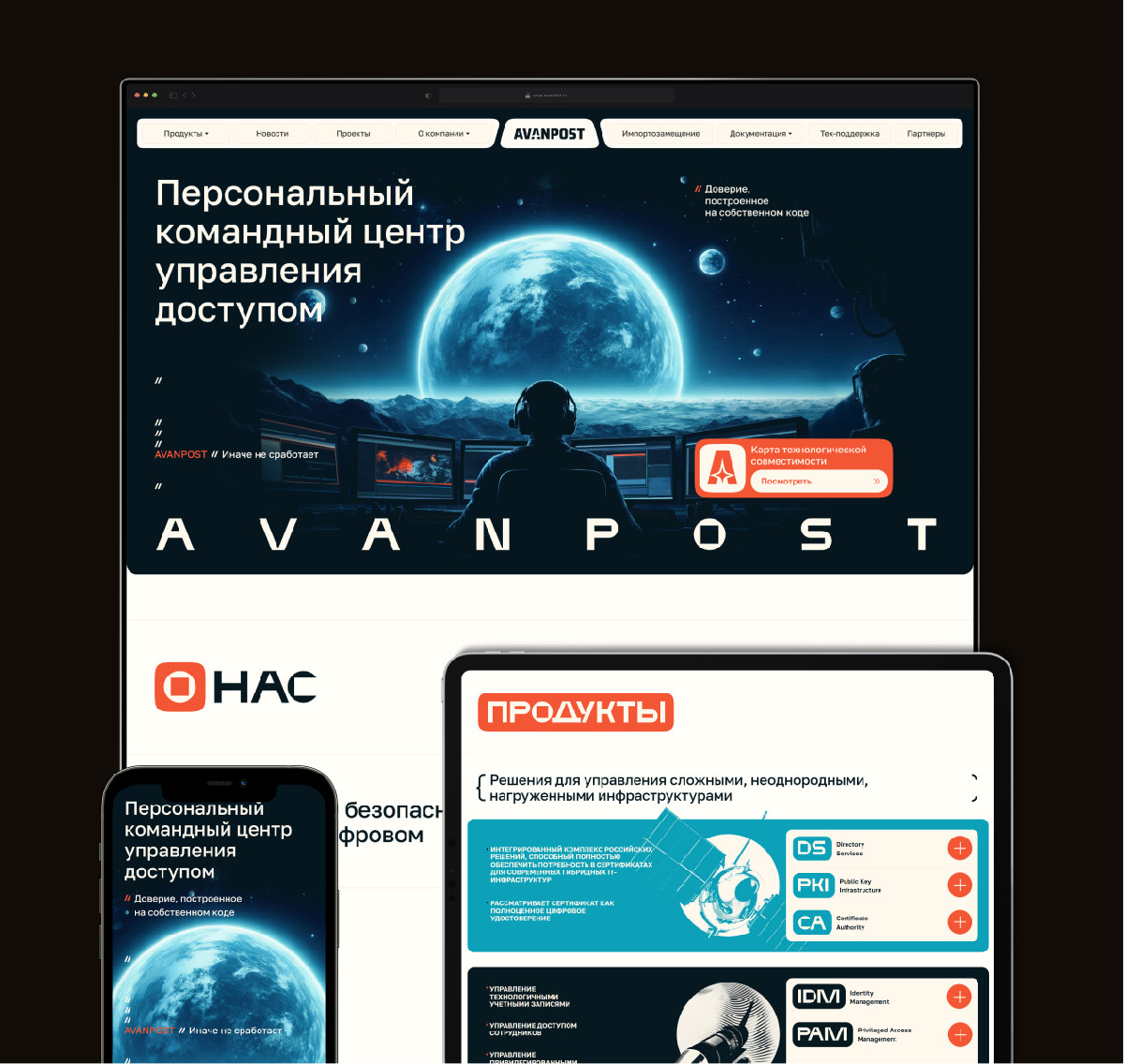 Геометрические паттерны звездных карт отражают идею научной сложности задач, которые решает AVANPOST. Блочная верстка — организует контейнерами разнообразный контент, как интерфейс панели управления, и позволяет легко масштабировать дизайн. А путеводная звезда, которая является базовой формой бренда, — ориентир для клиентов в мире ИБ.