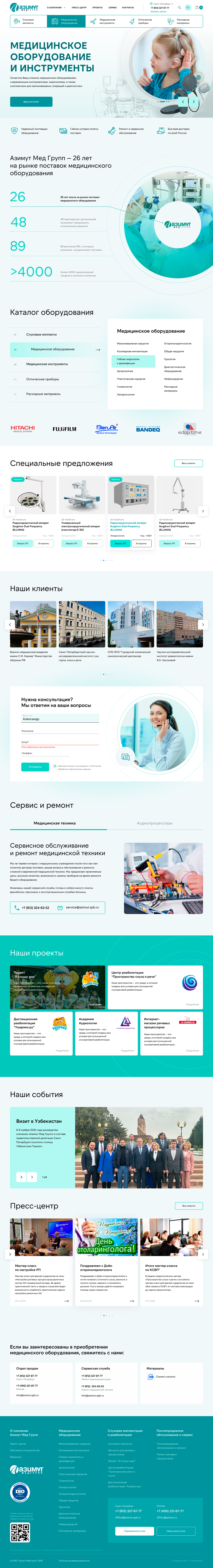 Приступая к проекту, мы поставили перед собой цель создать современный, удобный и структурированный корпоративный сайт для Азимут Мед Групп. На основе анализа старой версии были выявлены основные ограничения: визуальная перегруженность, слабая иерархия контента, неподходящая типографика и навигация, недостаточная адаптивность.