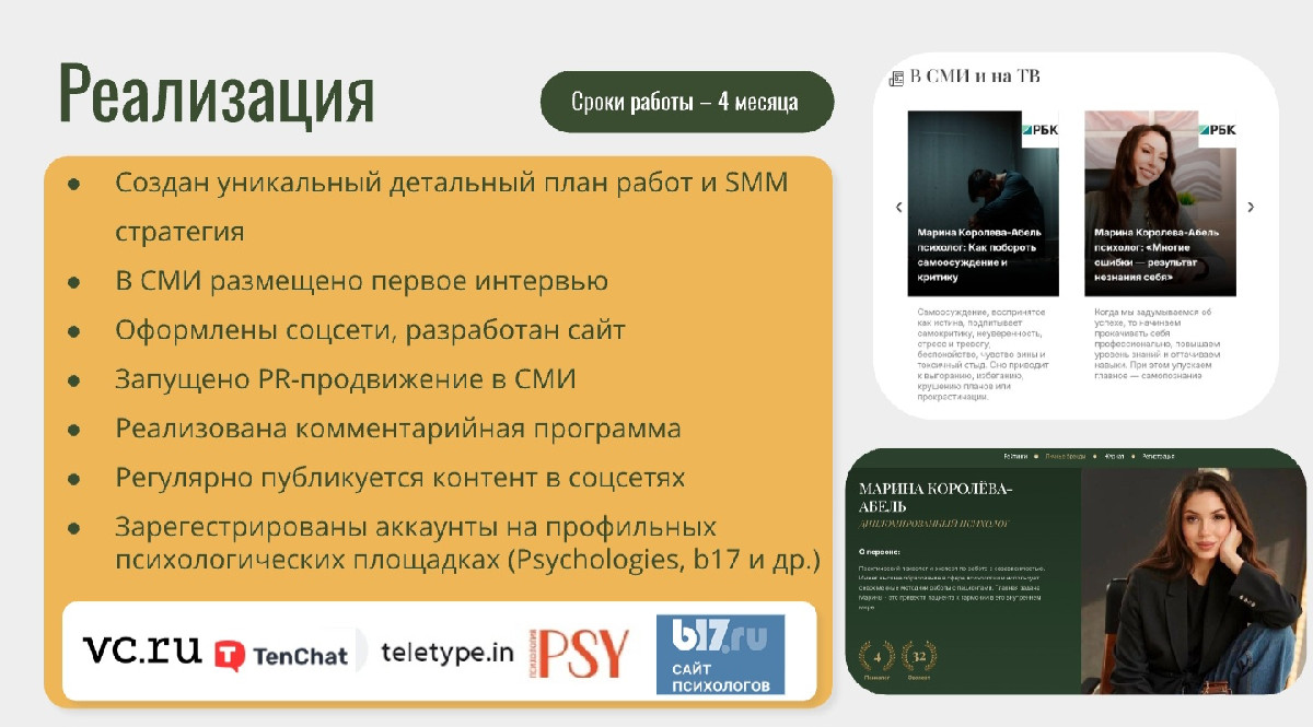 - Целенаправленное PR-продвижение: реализована стратегия, направленная на закрепление статуса востребованного специалиста в профильных и деловых СМИ.