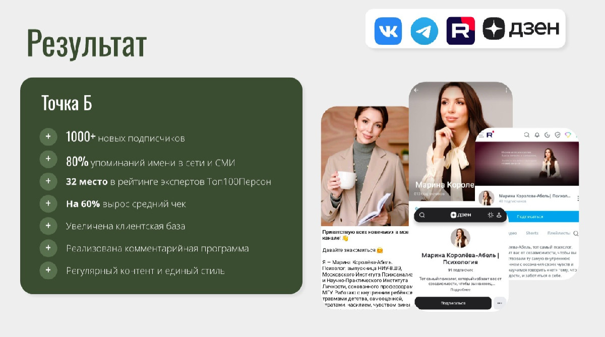 Системная работа над личным брендом Марины была выстроена в несколько ключевых этапов.