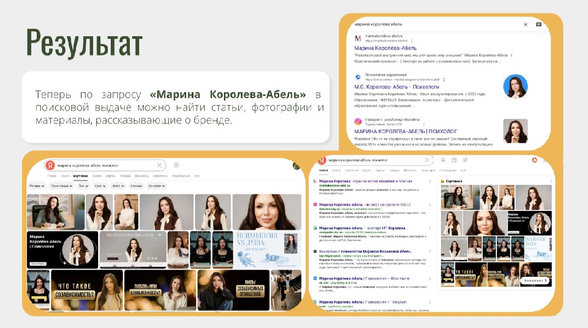 - Цифровой след как доказательство экспертизы: доля упоминаний имени Марины Королевой-Абель в сети и СМИ достигла 80%. По её запросу в поисковой выдаче теперь находятся десятки статей, интервью и материалов.