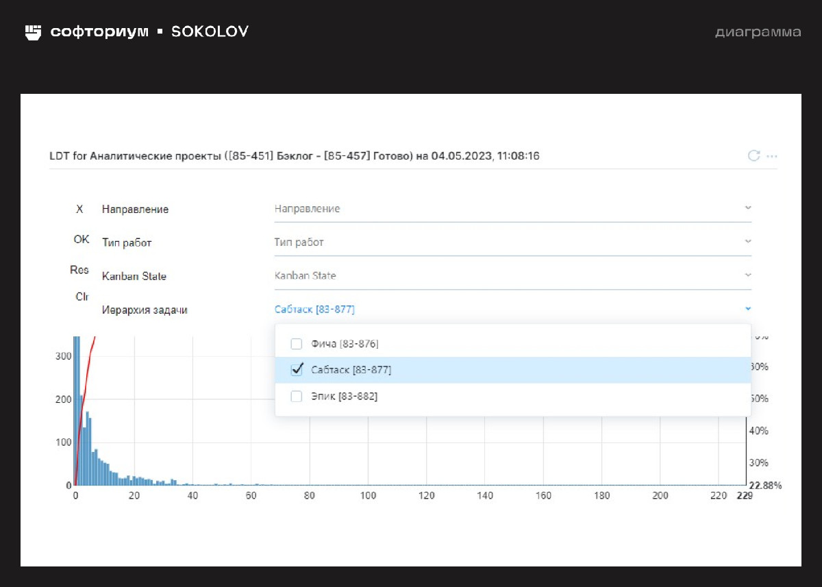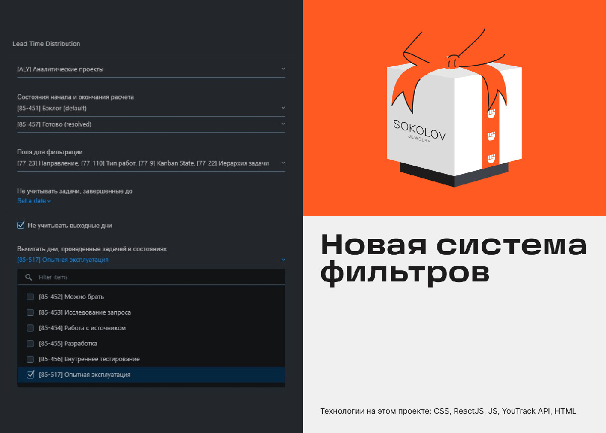 Теперь задачи в YouTrack фильтруются по нескольким параметрам: статус, тип работ, иерархия, направление. Дополнительно прикрутили функции учёта только рабочих дней и возможность вычитать дни, когда задача находилась в других статусах.