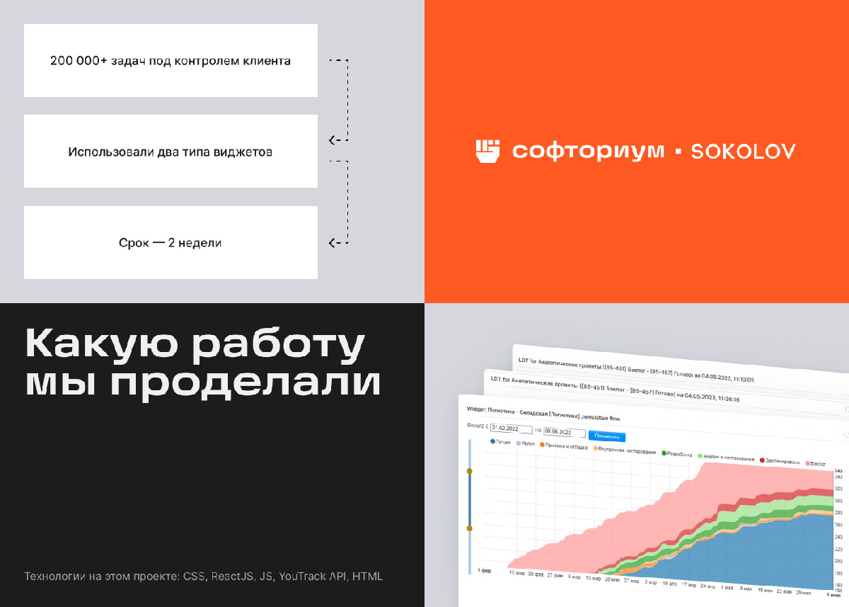 С YouTrack нам повезло только наполовину. В общих чертах создание виджетов было описано в документации. А в тонкостях — какие данные, какими методами и куда передавать — нам пришлось разбираться самостоятельно. Поэтому доработка сервиса заняла 2 недели, хотя могла занять несколько дней. Но даже в таких условиях мы сделали конфетку.