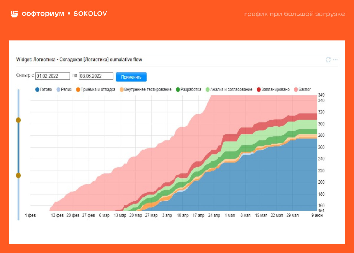 Это накопительная потоковая диаграмма — тип графиков, который придумали, чтобы оценивать прогресс проекта. Пока всё понятно!
