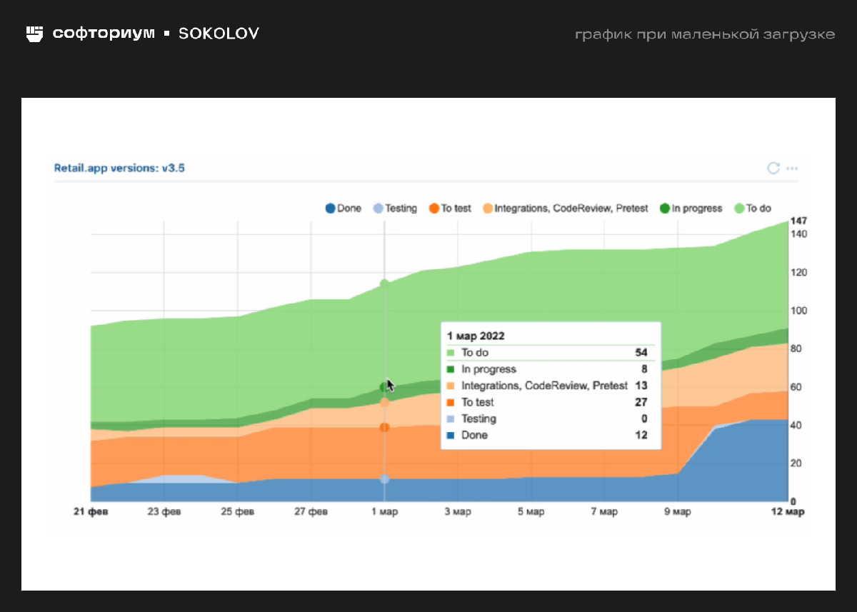 Чтобы увидеть цифры за конкретный день, нужно навести курсор мыши на узел — место пересечения даты и количества задач. Флоу не прибавляет диаграмме наглядности, а клиенту нужно было:
