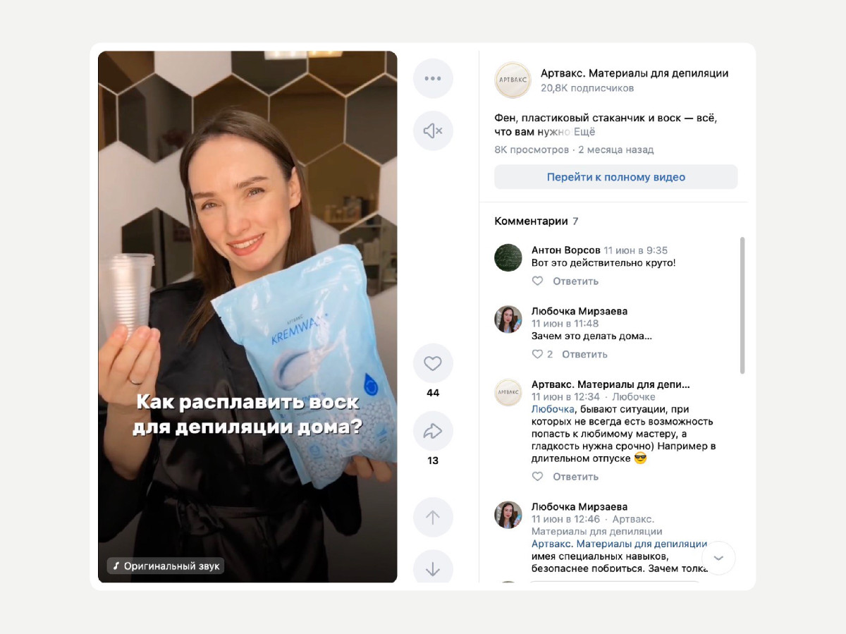 На момент марта 2025 у Артвакс был стандартный контент — посты о скидках, обзоры продуктов, прямые эфиры. Но живого общения с аудиторией было мало. При этом бренд имел сильное конкурентное преимущество — одну из самых низких цен на воск за 100 грамм на рынке.