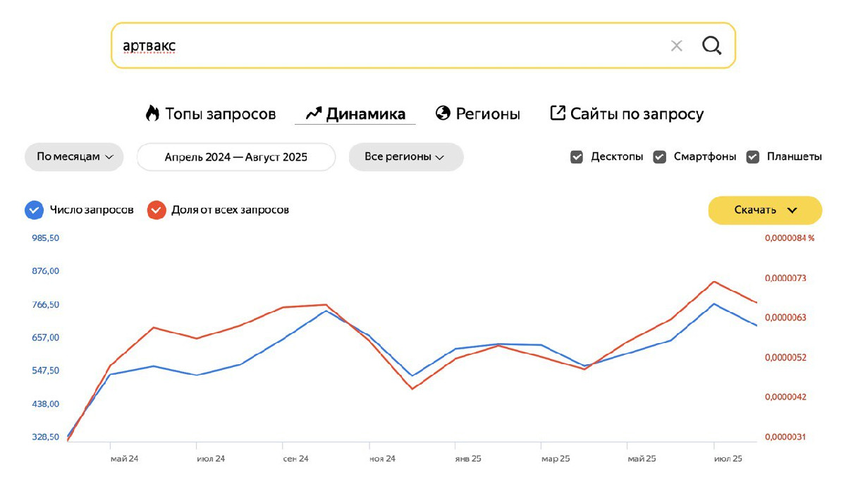 В июле 2025 случился рекорд по числу брендовых запросов в Яндекс Вордстате за всё время активности Артвакс в онлайн.