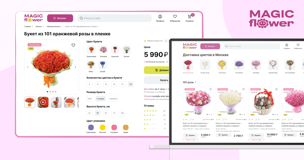 Magic Flower — интернет-магазин по доставке цветов, работающий в Москве и Санкт-Петербурге. Ранее Magic Flower обращались к нам за техническим сопровождением сайта и разработкой мобильного приложения, а в этот раз пришли с новыми задачами — доработкой и полным сопровождением сайта.