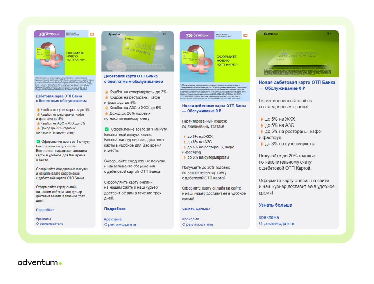 Основной акцент в рамках performance-кампании был сделан на дебетовую ОТП Карту с бесплатным обслуживанием, кэшбэком и начислением процентов на остаток средств.