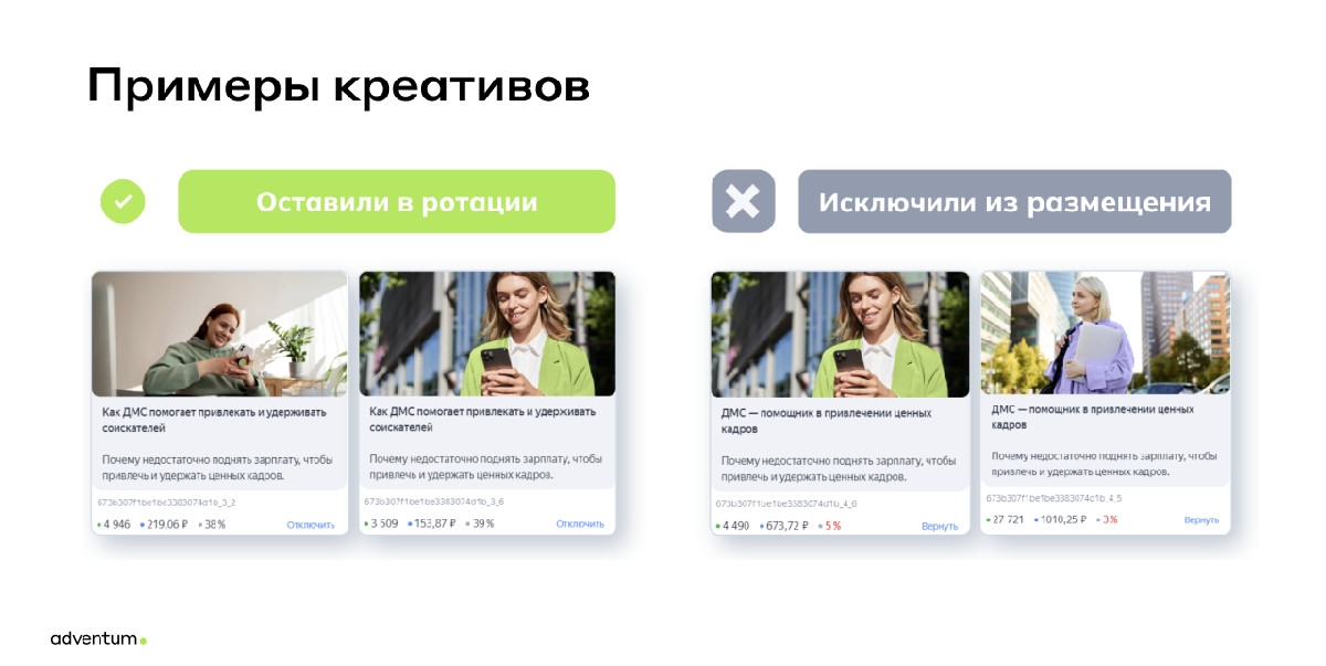- Сжатые сроки для обучения алгоритмов: при цели «дочитывание статьи» алгоритмам требуется 3-5 дней на обучение, так как найти целевую аудиторию, заинтересованную в теме, проще, чем тех, кто готов оформить продукт. Однако, поскольку целью было достижение «конверсий», алгоритмам потребовалось больше времени — 1-2 недели. В условиях тестового запуска (1,5 месяца) это ограничивало возможности для оптимизации.