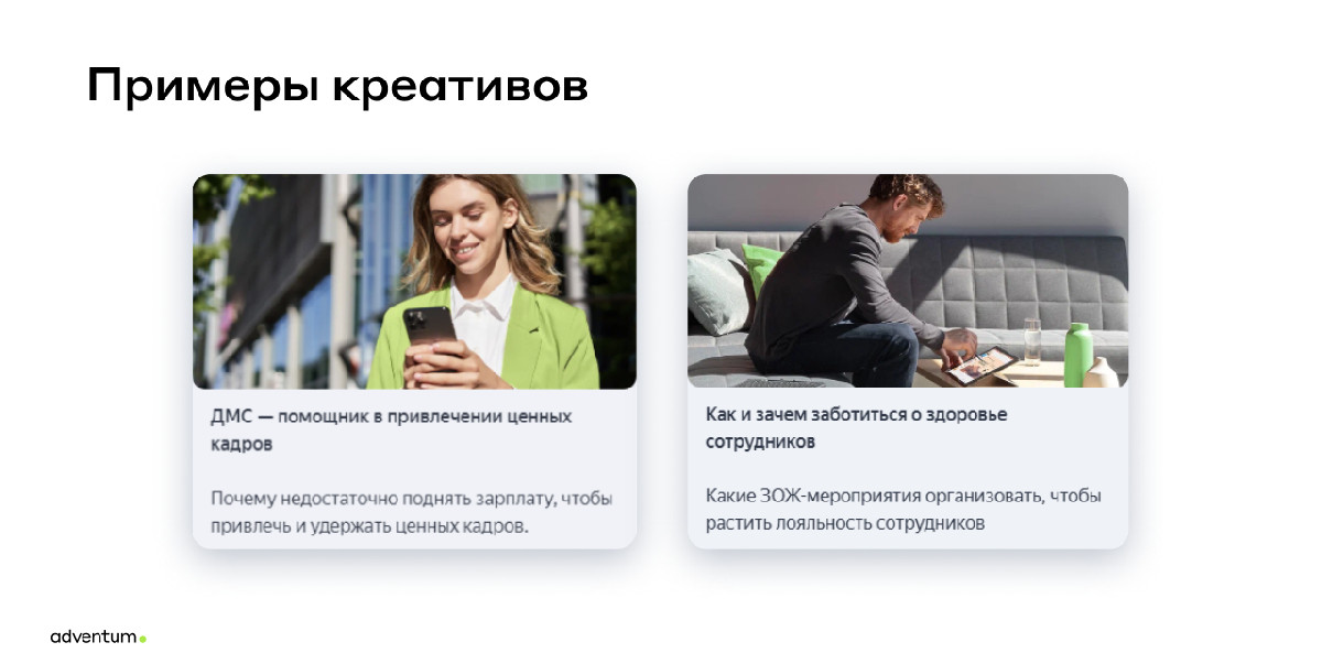 - Применяли разные виды таргетинга: ретаргетинг по посетителям бизнес-разделов сайта, таргетинг по тем, кто посетил страницу корпоративного ДМС без заявки, и по интересам, связанным с бизнесом.
