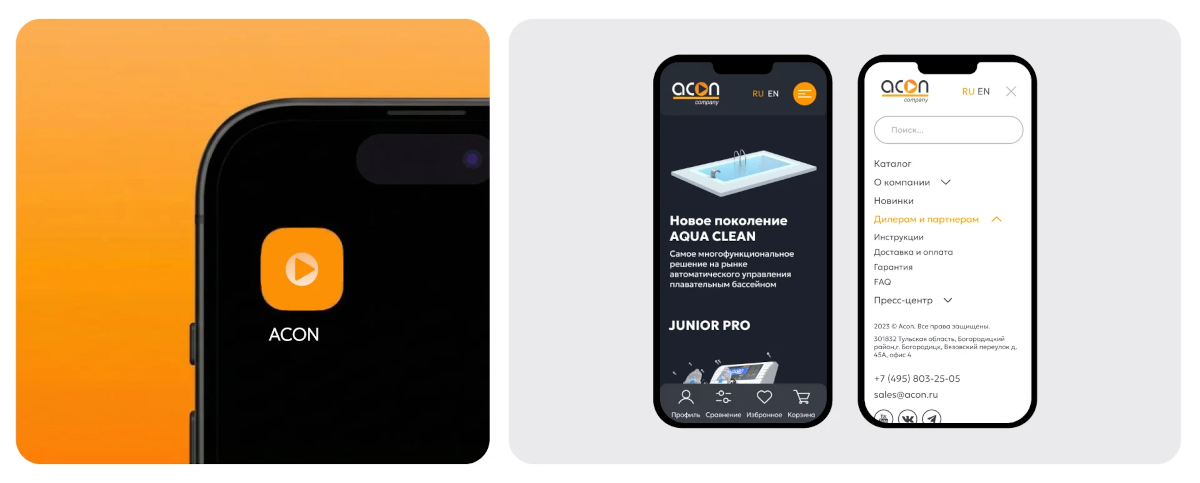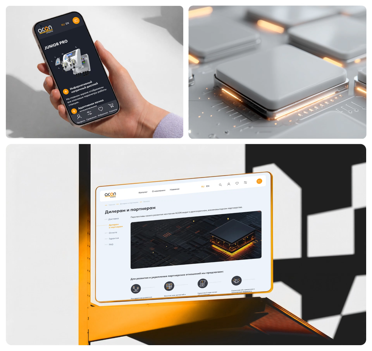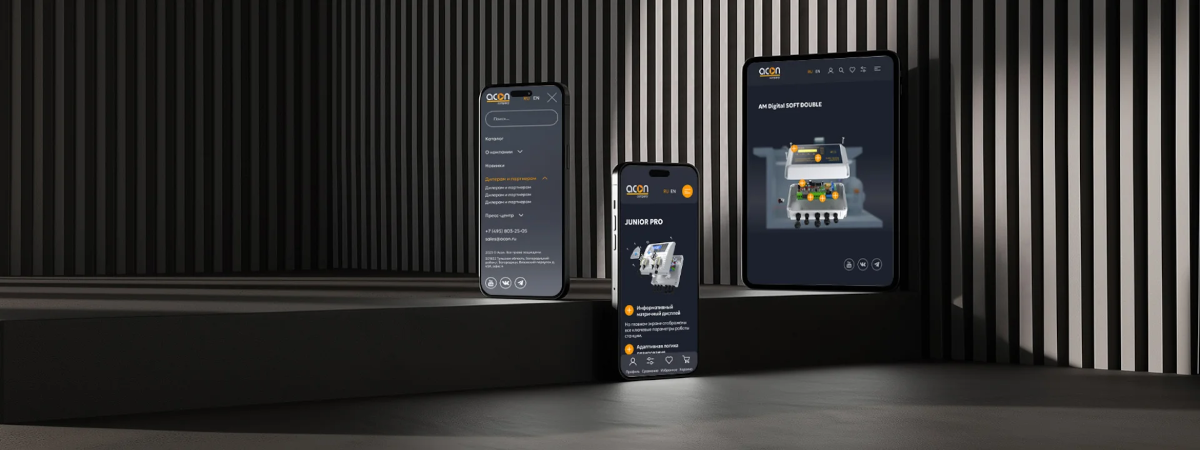 У нас вышел сайт, который одновременно решает задачи и клиентов, и дилеров. Первым он показывает мощь ACON через эффектную 3D-анимацию. Вторым — даёт удобный личный кабинет для работы.