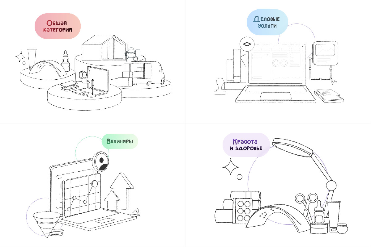 Создали четыре 3D-иллюстрации: по одной для категорий «Красота и здоровье», «Деловые услуги», «Вебинары», а также одну общую для всех этих услуг.