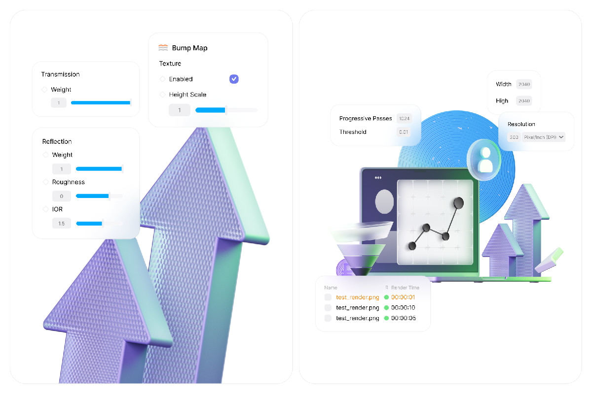 Выставляем простое освещение и создаем цветовую палитру, которая будет гармонировать с общим стилем. Регулируем параметры отражения, преломления и прозрачности объектов, добавляем фактуры с использованием карт нормалей или дисплейсмента, чтобы изображение воспринималось реалистично. Проверяем, всё ли сочетается друг с другом и соответствует гайдлайнам.