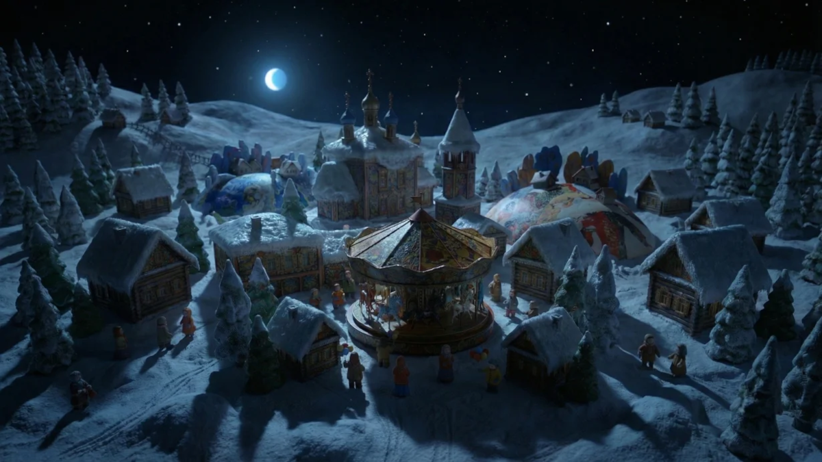 Для иллюстрации временного побега от рутины мы придумали историю про деревянную лошадку, сбегающую с новогодней карусели, чтобы совершить сказочное путешествие сквозь зимнюю ночь, наполненную волшебными пейзажами и их обитателями. Стилистическим решением, призванным создать ощущение праздника, была нейросетевая имитация знакомых с детства советских кукольных мультфильмов, которыми телевизор щедро одаривал детей в новогодние каникулы.