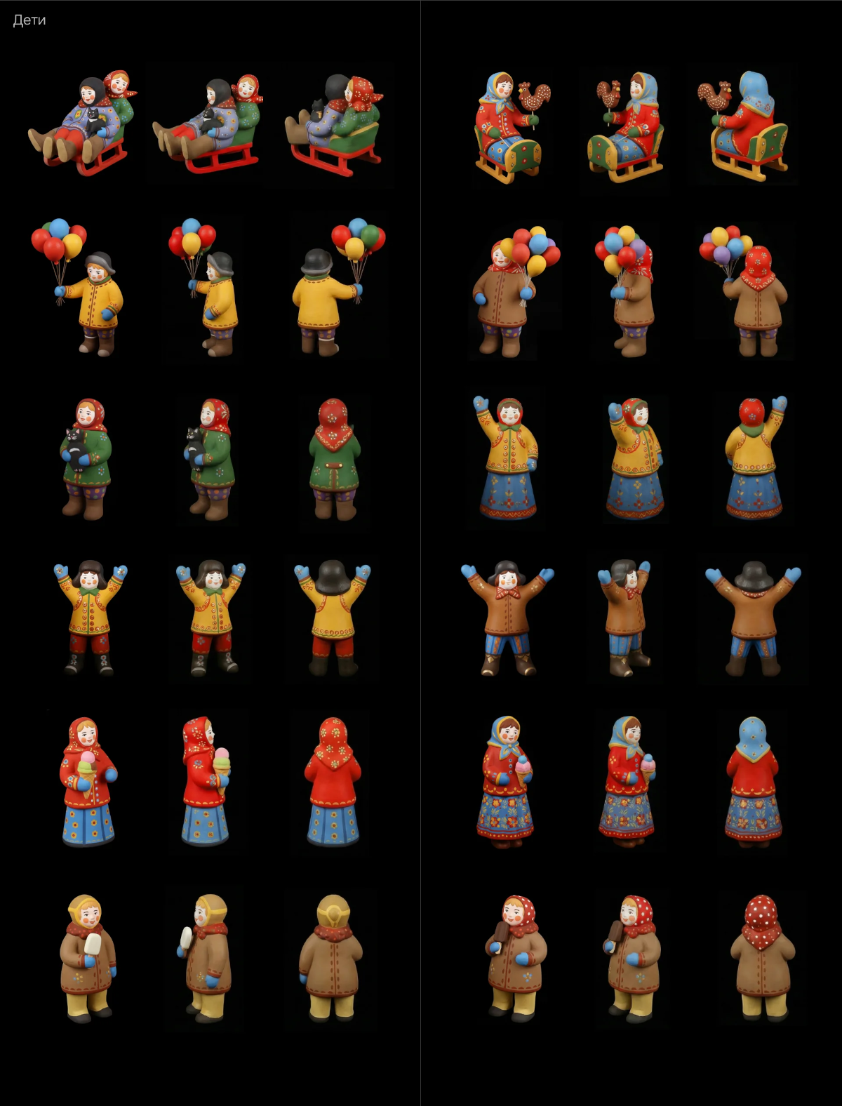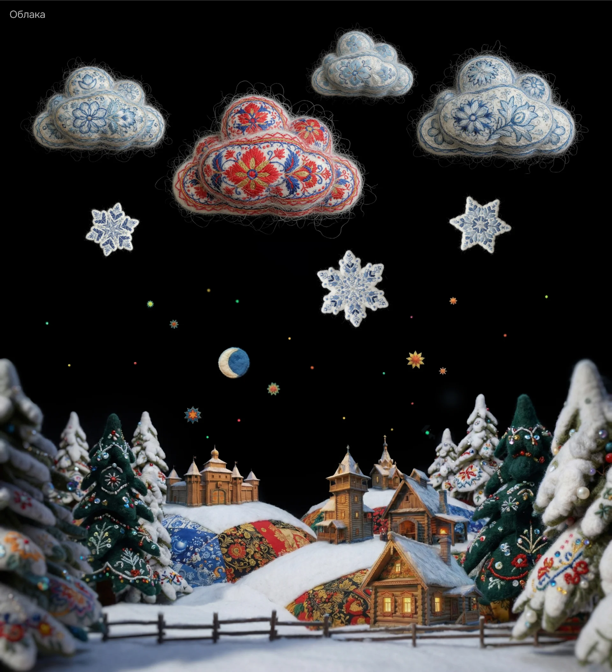 Соединить элементы в произвольные локации предоставили нейросетям, с чем они успешно справились, создав атмосферу разгульного праздника и полета через загадочные леса и уютные селенья. Вместо ожидаемой эклектики мы получили насыщенную цветами и текстурами, но вполне цельную мозаику.