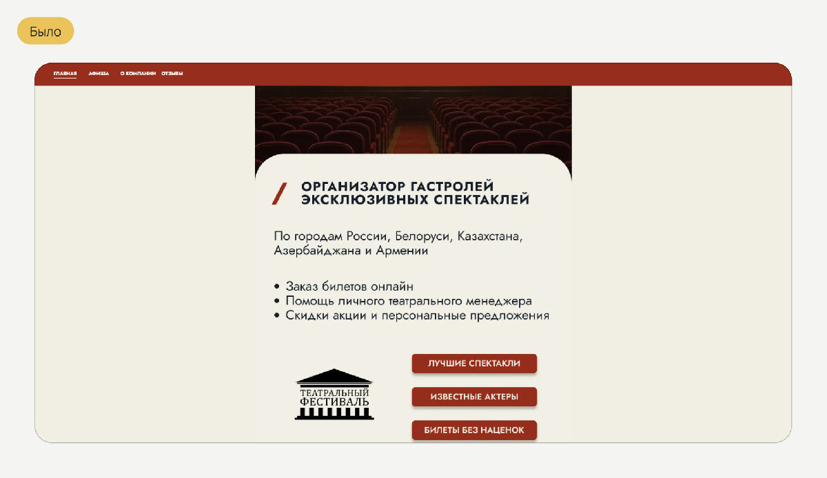 - сайт не отражал масштаб проекта: пользователь не видел на одном ресурсе весь репертуар и географию гастролей.