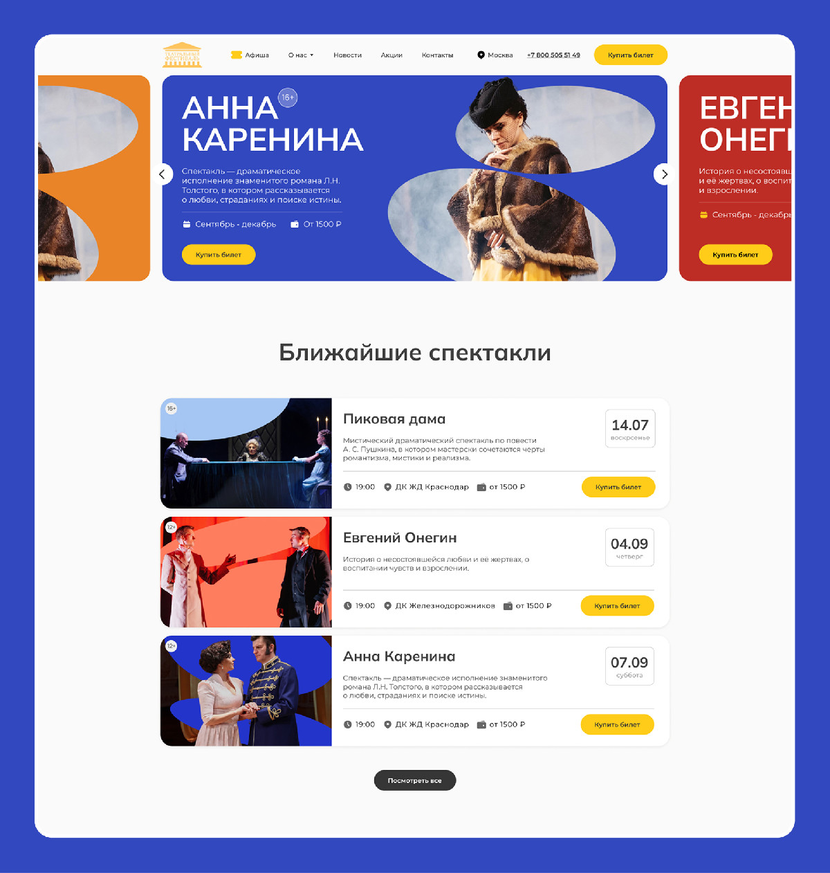 Крупные фотографии артистов и визуальный эффект направленного света создают ощущение сцены – будто уже поднялся занавес, и спектакль вот-вот начнётся. Вся композиция построена по центру – это помогает сфокусировать внимание на главном: афише и кнопке действия. Ближайшие спектакли вынесены в яркие карточки. Они хорошо читаются и сразу подсказывают, куда идти. Стилизованы под театральные билеты.