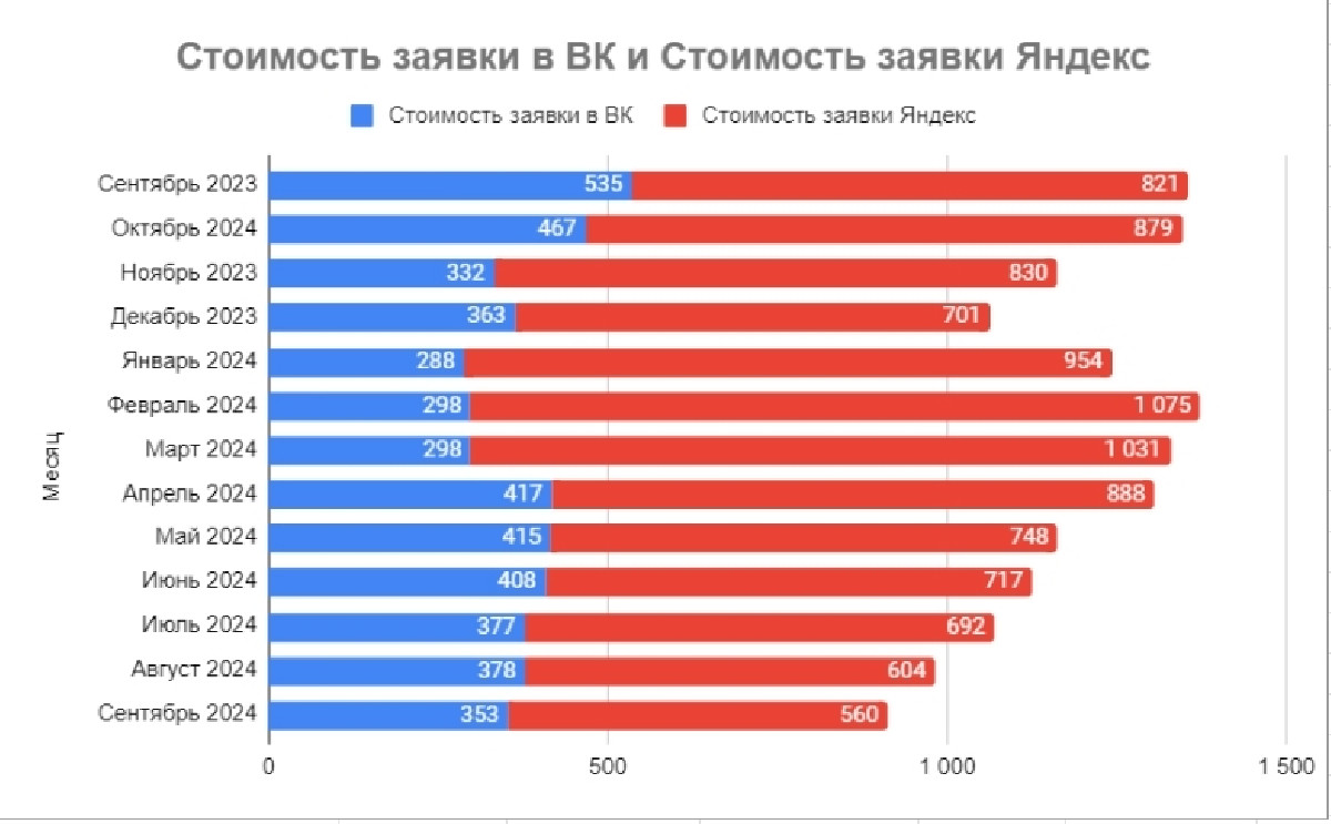 Средняя стоимость клика в Вконтакте - 27-35 руб. Это наша целевая планка. Этим можно управлять. В Яндексе стоимость клика можно снижать за счет запуске рекламы в РСЯ (рекламная сеть Яндекс), где наши баннеры начнут появляться на различных площадках и сайтах (от АВИТО до Mail.ru) НО! по статистике из Яндекс заявок конверсия в договор выше. Это нужно учитывать при планировании рекламного бюджета.