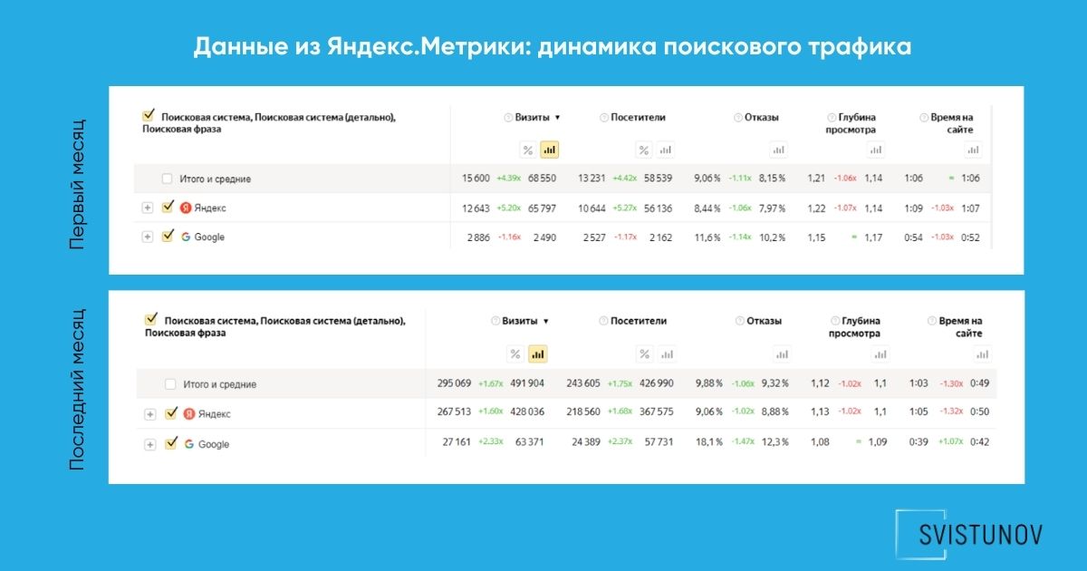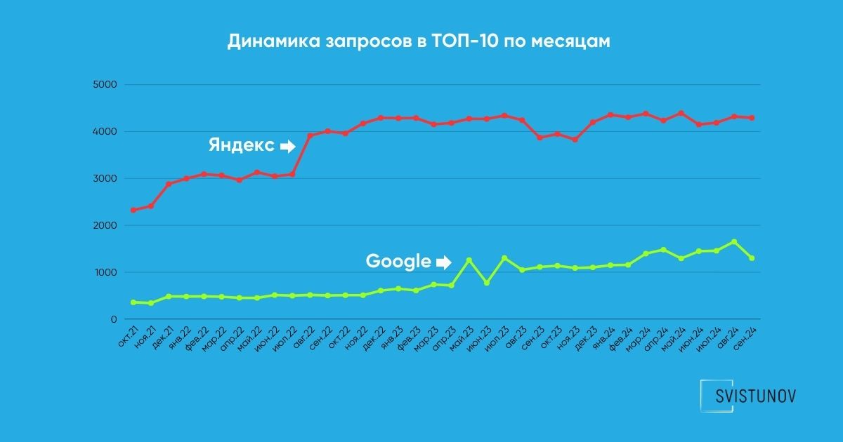 Работали циклами, собирая задачи в пакеты для согласования. В 2021 году разделили отчётность на брендовый и небрендовый трафик, фиксировали изменения по ключевым страницам и формам заявок. В 2023 году усилили аналитику за счёт кластеризации семантики, интентов, видимости и позиций, добавив разрезы по устройствам, географии и поведению пользователей.