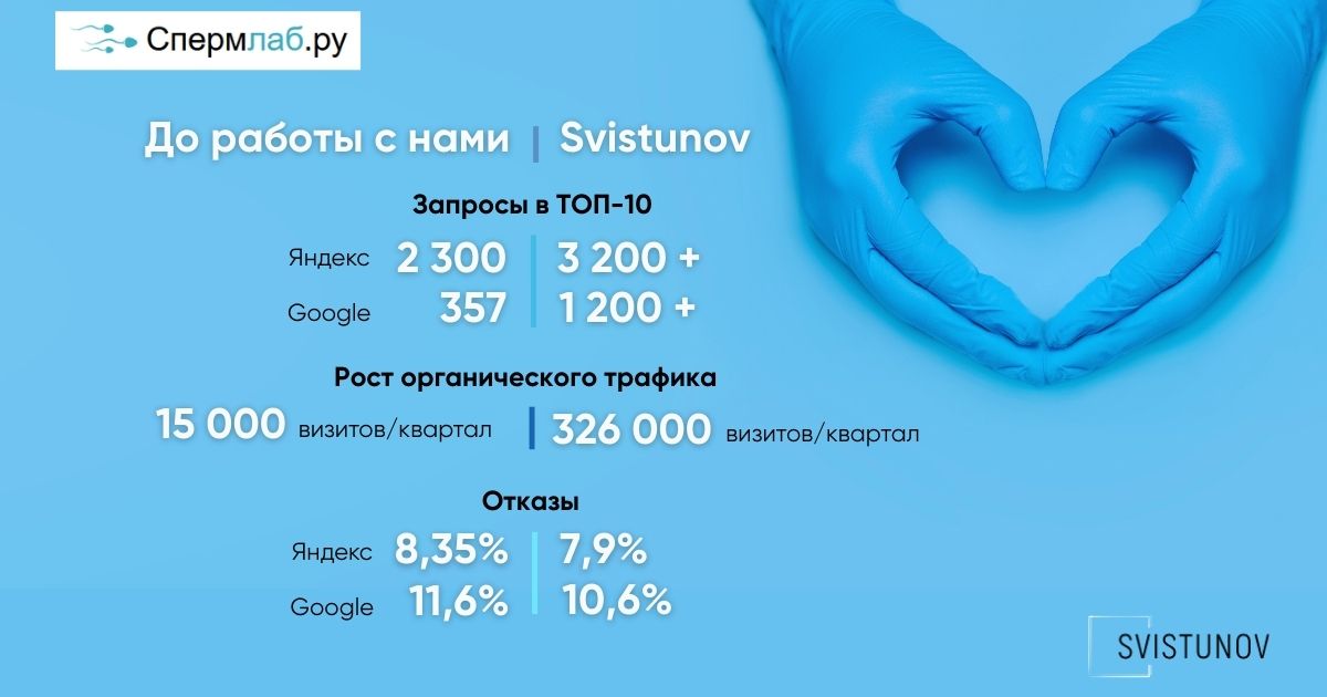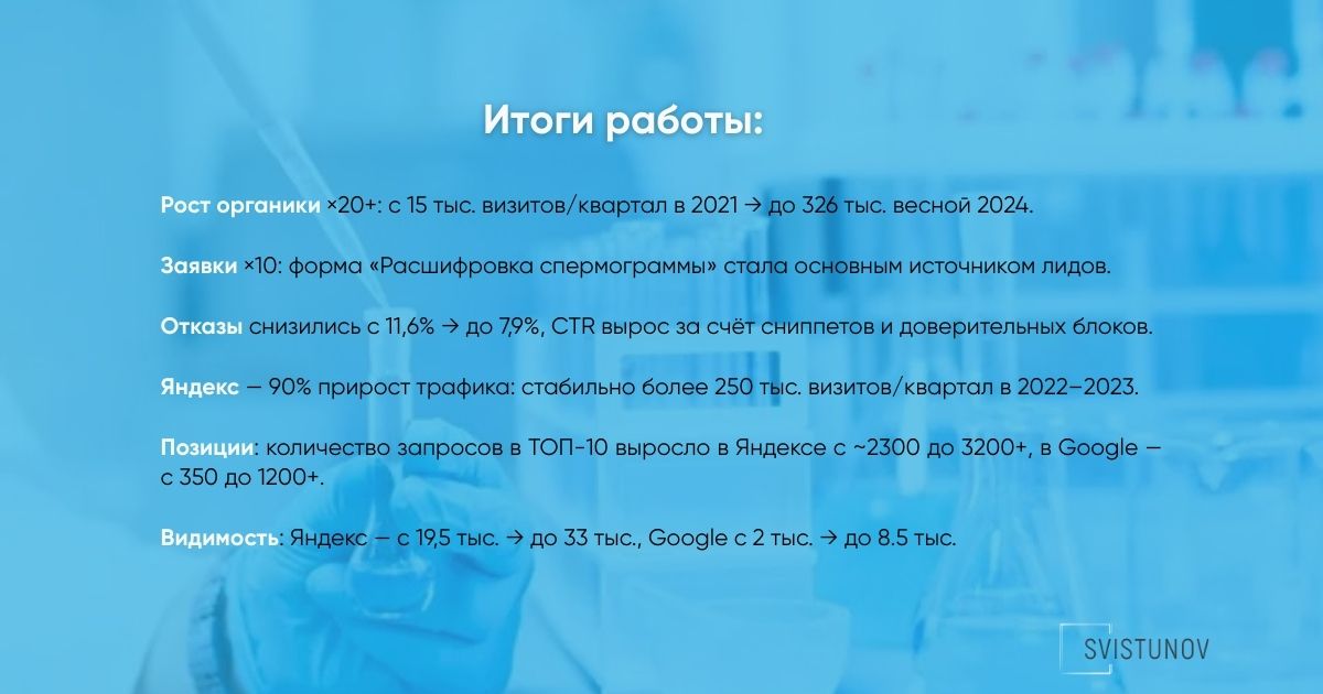Проект Spermlab показал, что в медицинской тематике с повышенными требованиями к доверию и юридической корректности SEO может давать устойчивый и прогнозируемый результат при системном подходе.