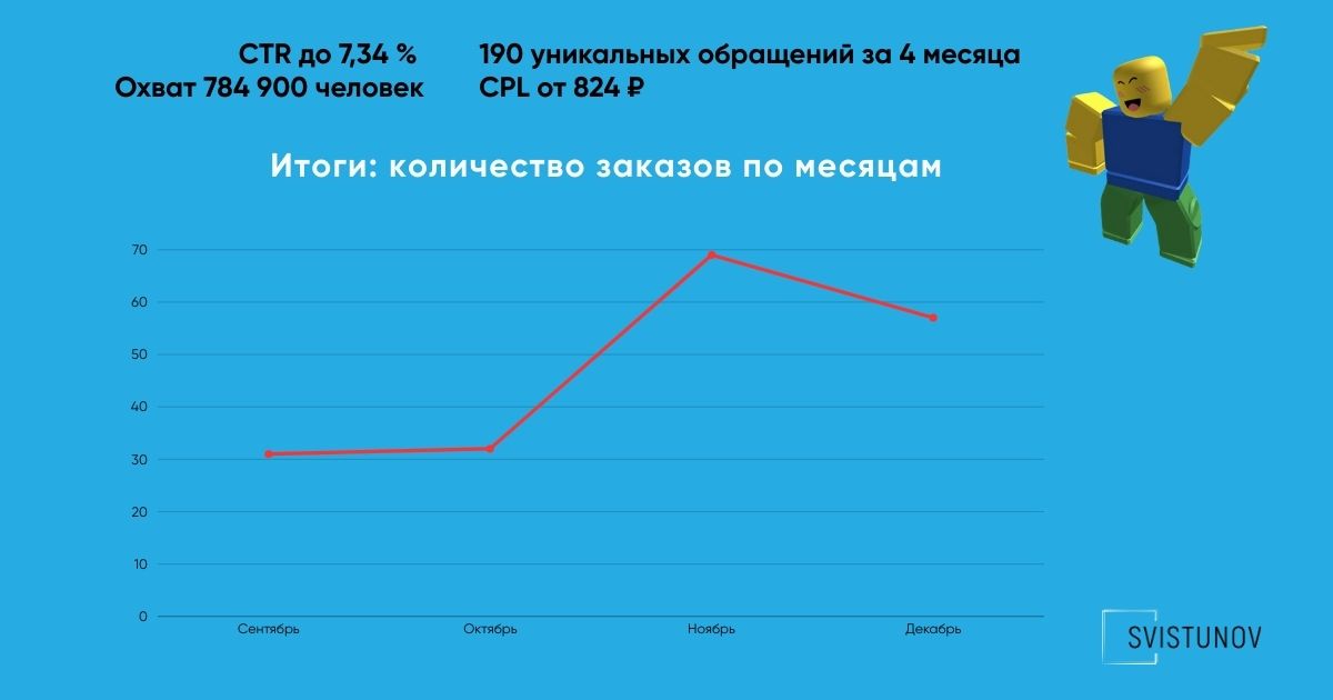 Пиковым месяцем стал ноябрь: резкий рост обращений произошёл после запуска отдельной посадочной под детские дни рождения и смены креативов на эмоциональные визуалы с реальными фото и видео.