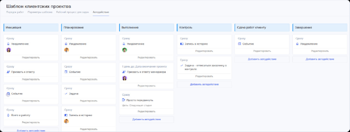 • В систему были интегрированы все необходимые инструменты, такие как автодействия, напоминания о дедлайнах и создание отчетности.