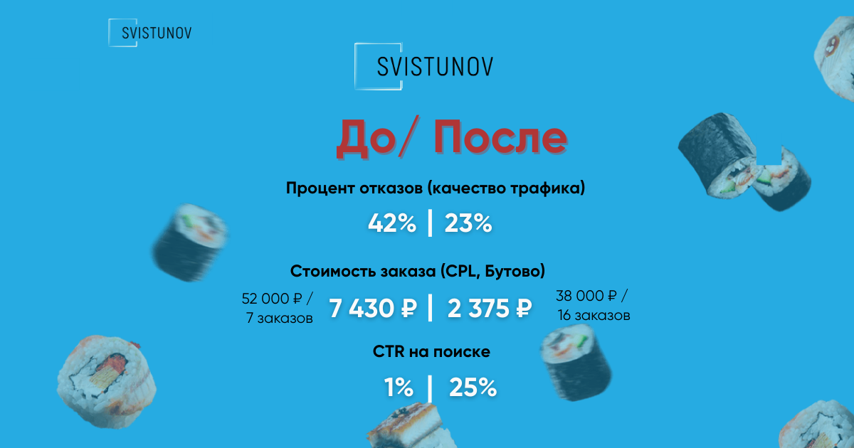 Февраль (1,5 месяца работы): CTR стабилизировался на 2–3% в РСЯ и приложениях. Появились первые регулярные заказы. Отказы упали с 42% до 27%.